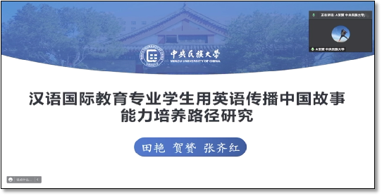 田艳带领2021级硕士研究生贺赟、张齐红参与了论坛四的分组报告,报告题目为《汉语国际教育专业学生用英语传播中国故事能力培养路径研究》。报告从当今时代背景与汉语国际教育硕士专业培养方案出发,结合本专业学生用英语传播中国故事能力培养的现状,尝试探索切实可行的能力培养模式。报告创造性地提出“课程性培养—形成性展示—实践性演练”三位一体的培养路径。