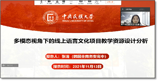 2020级硕士研究生张清参与了论坛一的分组报告,报告题目为《多模态视角下的线上语言文化项目教学资源设计分析》。该报告以2021年线上“汉语桥”团组项目为研究对象,以多模态理论为基础,运用课堂观察、内容分析和问卷调查等研究方法,分析了该项目在视觉、听觉和触觉等多模态教学设计和使用的情况。