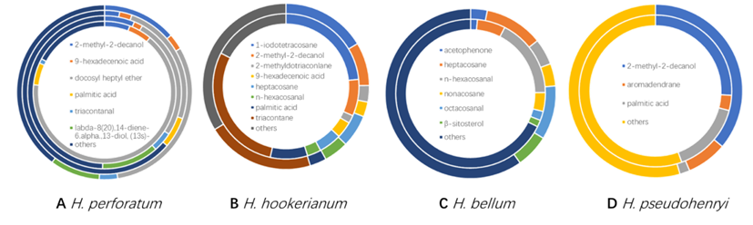 金丝桃属植物4个种不同部位代表性成分,圆环由内到外排序:(A)贯叶连翘:巫溪种群枝;巫溪种群叶;巫山种群枝;巫山种群叶。(B)短柱金丝桃:枝,叶。(C)美丽金丝桃:枝,叶。(D)北栽秧花:枝,叶。