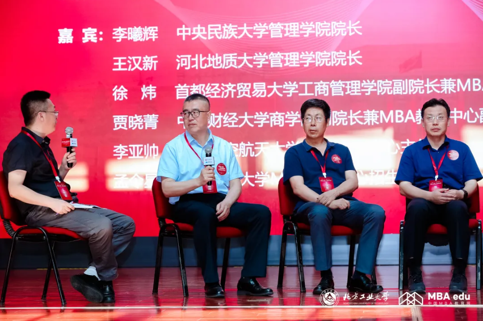 时代的发展在不断变化,对于人才的需求也在不断发生变化。针对商学院建设与人才培养,商学院一直在做出积极探索与实践。圆桌对话环节,李曦辉与河北地质大学管理学院院长王汉新、中央财经大学商学院副院长兼MBA中心副主任贾晓菁、首都经济贸易大学工商管理学院副院长兼MBA中心主任徐炜、北京航空航天大学MBA教育中心主任李亚帅、中国政法大学MBA教育中心招生部主任孟令星作为发言嘉宾围绕“MBA项目创新发展与内部管理提升”展开交流与讨论。圆桌对话由北方工业大学MBA教育中心主任纪雪洪主持。