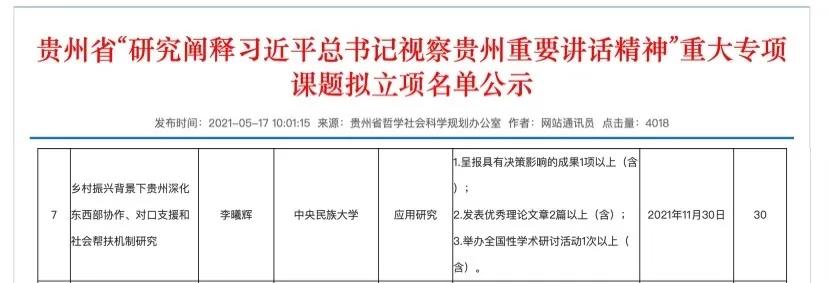 新闻网讯 近日,我校管理学院李曦辉教授领衔,黄基鑫博士等人共同参与申报的“乡村振兴背景下贵州深化东西部协作、对口支援和社会帮扶机制研究”获准立项贵州省“研究阐释习近平总书记视察贵州重要讲话精神”重大专项课题。