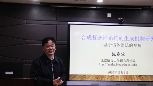 本次讲座的题目是“合成复合词系统的生成机制研究——基于语体语法的视角”。 施春宏教授在既有研究的基础上提出了新的分析角度,以期对合成复合词各种类型的生成机制及其约束条件做出更为一致性的描写和解释。施春宏教授首先系统描写了合成复合词系统复杂多样的组配类型及其合法性和合用性表现,并概括了学界关于合成复合词生成条件所讨论的主要方面及需要解决的问题。施教授耐心细致地回答了在场同学对相关问题的疑问,为同学们日后研究方向和研究方法的选择拓宽了思路。
