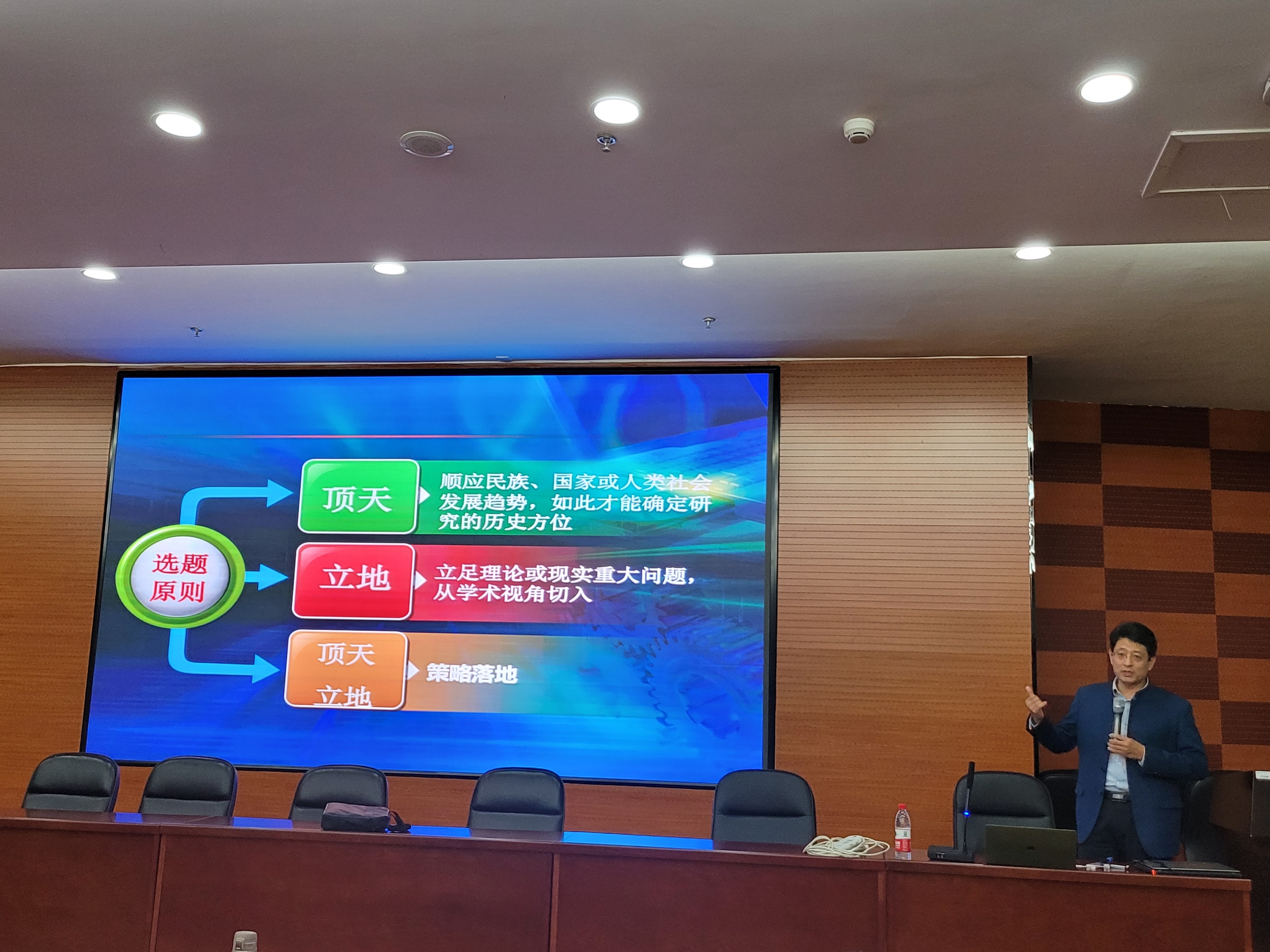 张晓义首先强调选题应具有学术价值、应用价值,为方便理解,张教授用“顶天立地”概括了选题时应该注意的问题,“顶天”即顺应民族、国家、人类社会发展趋势;“立地”即立足理论或者现实中的重大问题并从学术视角切入,促进策略落地。随后,他引用具体实例分析学生在选题过程中容易出现的错误。