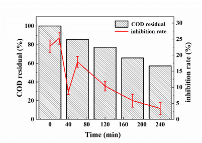 本研究利用简便且易操控的电化学氧化装置对于SMX降解条件进行了系统研究,结合密度泛函理论(density functional theory,DFT)计算和LC-MS分析推测了3种可能的降解途径,为SMX在电化学系统中的降解机理分析提供了宝贵信息(图1)。利用发光细菌法对中间产物的生物毒性进行测试,降解2小时,COD剩余量在75%左右,而生物毒性已经降至环境安全水平以内,保证了后续降解的安全性(图2)。