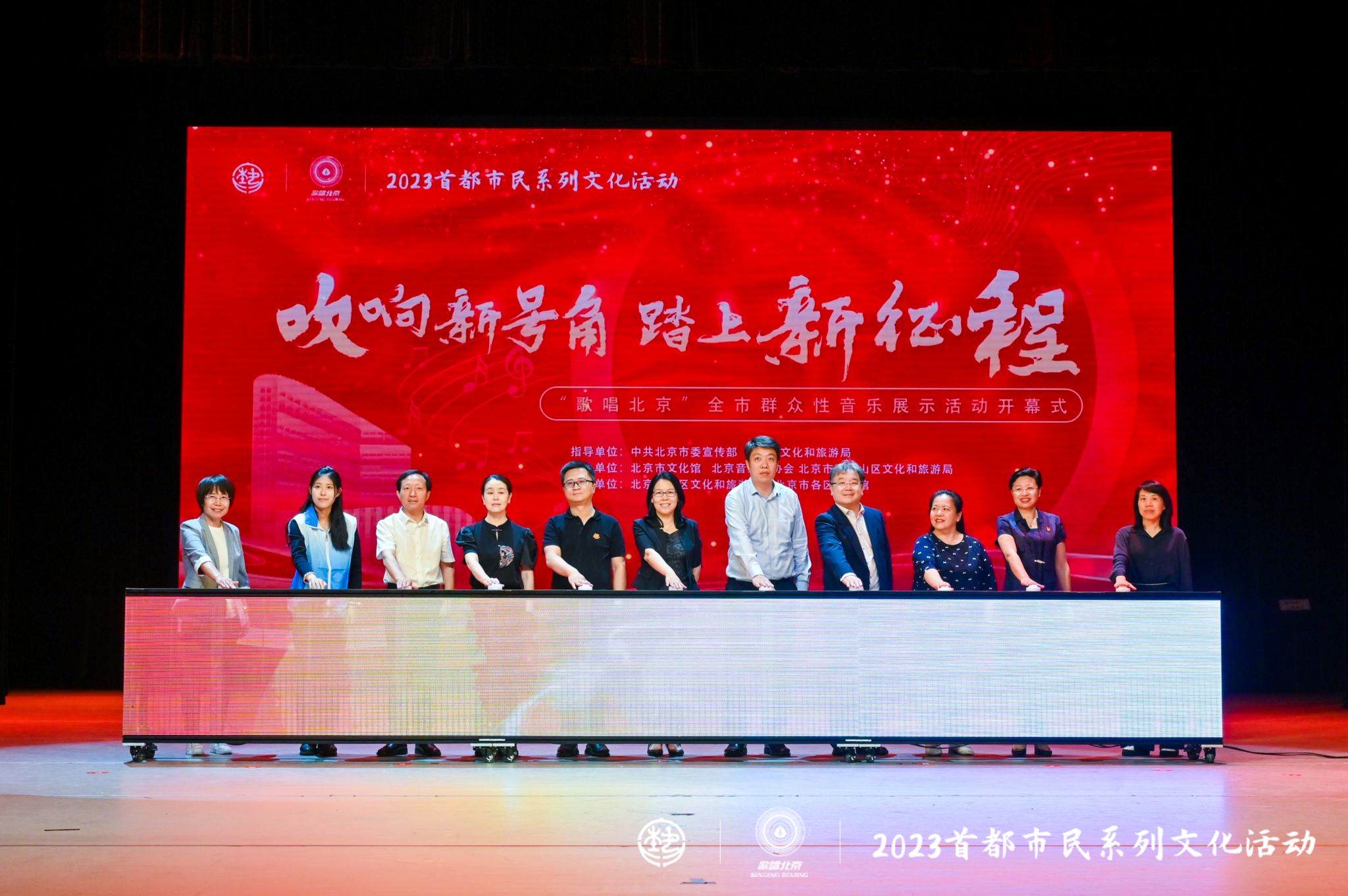 新闻网讯 5月26日上午,以“吹响新号角,踏上新征程”为主题的“歌唱北京”首都全市群众性音乐展示活动开幕式在石景山区文化中心举行。全国公共文化发展中心文化馆处处长、中国文化馆协会秘书长赵保颖,北京市教育委员会体育卫生与艺术教育处副处长徐春生,北京市文化馆党总支书记、馆长王维波,以及各区文化馆相关领导,各高校代表,专家代表,合唱团、乐团以及市民代表、媒体等近500人参加开幕式。