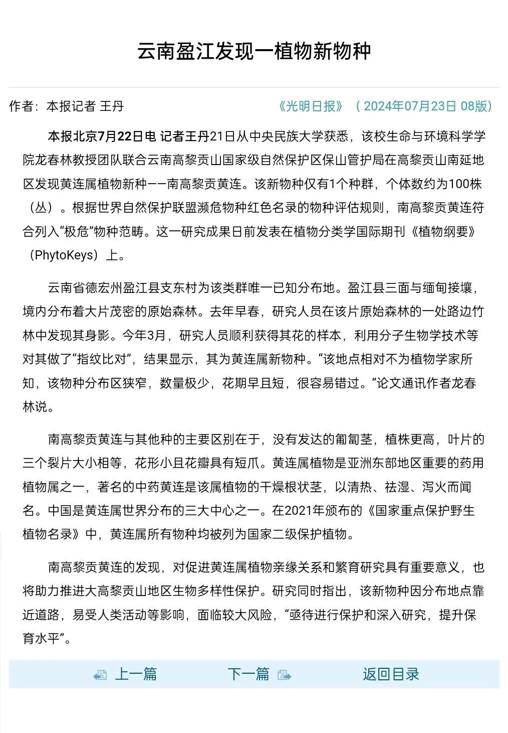 新闻网讯 近日,《光明日报》报道了学校生命与环境科学学院龙春林教授团队联合高黎贡山国家级自然保护区保山管护局等单位在高黎贡山南延地发现的极度濒危黄连属植物新种南高黎贡黄连(Coptis austrogaoligongensis C. L. Long & Z. Cheng, sp. nov.)。《人民日报》客户端、央视新闻、新华网、人民网、云南网、新重庆等各大媒体也纷纷报道该发现。下文为《光明日报》报道原文。