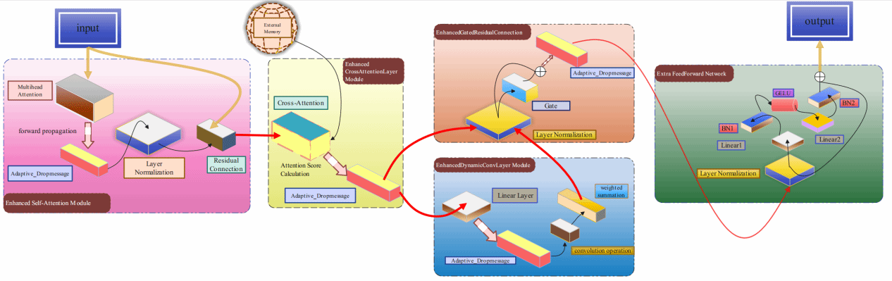 本研究针对中文互联网短新闻文本数量与日俱增,如何快速、准确地生成这些文本的精炼摘要所带来的挑战,综合应用自适应消息丢弃技术(Adaptive-DropMessage)、动态卷积层、门控残差连接、自定义前馈网络及增强的自注意力和交叉注意力机制等,首次提出了针对中文短新闻文本摘要的一种基于mBART框架的创新模型——DMSeqNet-mBART,如下图所示。实验效果表明该模型显著提升了摘要的流畅性、完整性和准确性,并在多个权威数据集上超越了当前的业界领先模型,如T5、MLC、PLCC和GPT-4。尤其在BERTScore、BLEU和ROUGE等关键指标上,DMSeqNet-mBART的表现尤为突出。