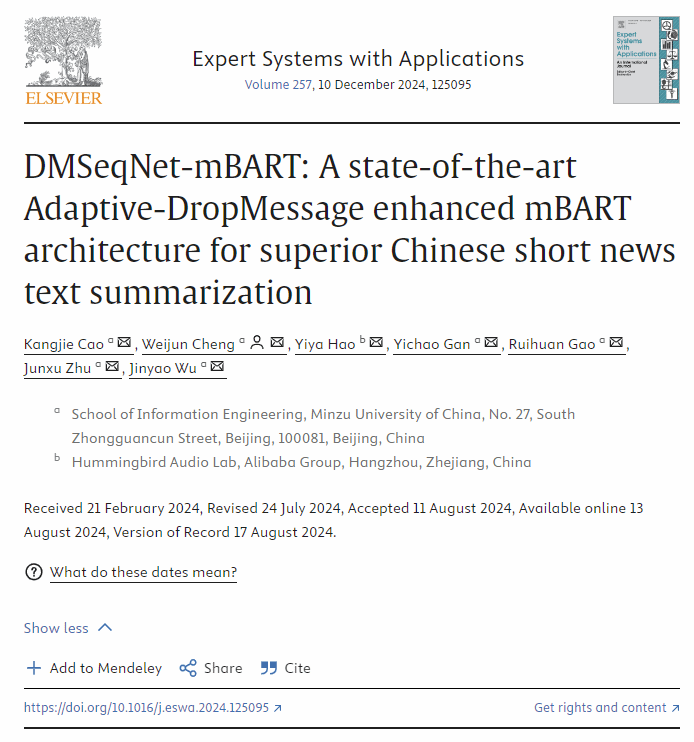 新闻网讯 近日,信息工程学院本科生曹康杰以第一作者在《Expert Systems With Applications》期刊上发表题目为“DMSeqNet-mBART: A state-of-the-art Adaptive-DropMessage enhanced mBART architecture for superior Chinese short news text summarization”的研究成果(论文链接:https://doi.org/10.1016/j.eswa.2024.125095)。论文通讯作者程卫军副教授给予了全程指导,同时也受到了阿里巴巴Hummingbird Audio 实验室郝一亚博士后的指导,论文合作者还包括本科生甘一超等4位同学,并做出了相应的贡献。《Expert Systems With Applications》是人工智能、运筹学等领域国际顶级期刊,在全球具有较强的学术影响力。