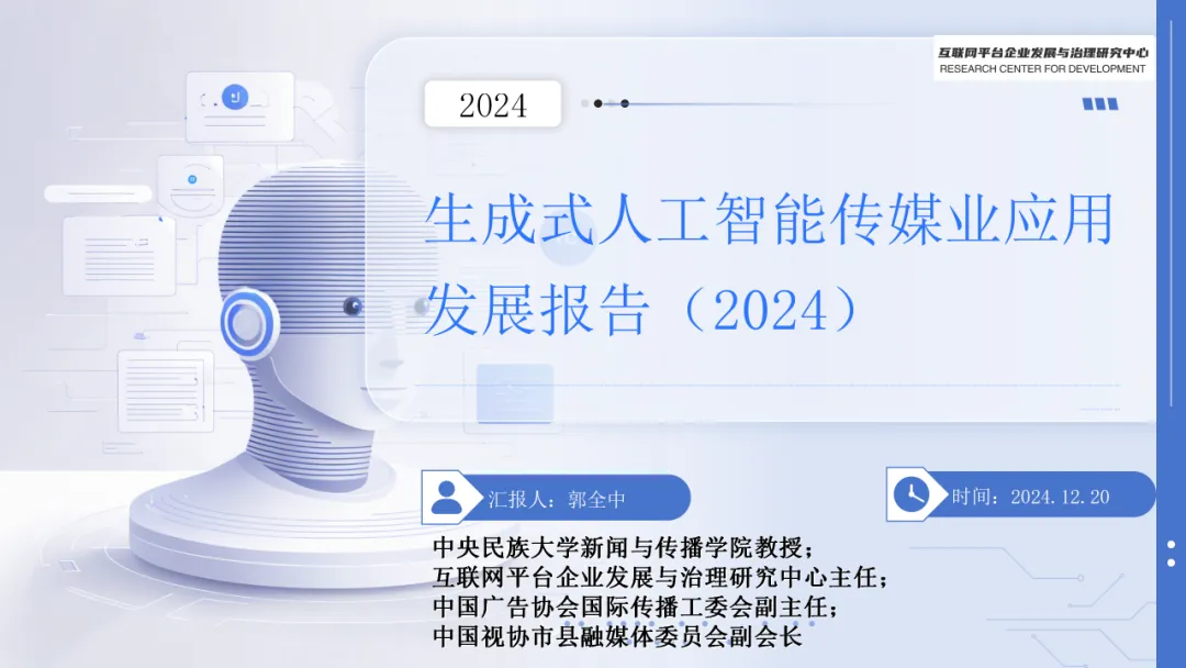 在主题分享阶段,新闻与传播学院教授郭全中汇报了《生成式人工智能传媒业应用发展报告(2024)》,报告从大模型的发展情况、传媒业大模型的应用情况、大模型治理以及传媒业大模型的未来展望四部分展开梳理,在扫描大模型投融资、监管情况与技术前沿的基础上,指出生成式AI给传媒业带来三重变革——"生产、生态、营销",结合方正电子、拓尔思、传播大脑、人民日报、新华社等案例呈现AI技术与传媒实践的有效结合与双向赋能,提出并多维阐释了平衡发展与管理的Gen AI管理新理念——“敏捷治理”理念,强调更具自适应、包容性和可持续性的管理理念。