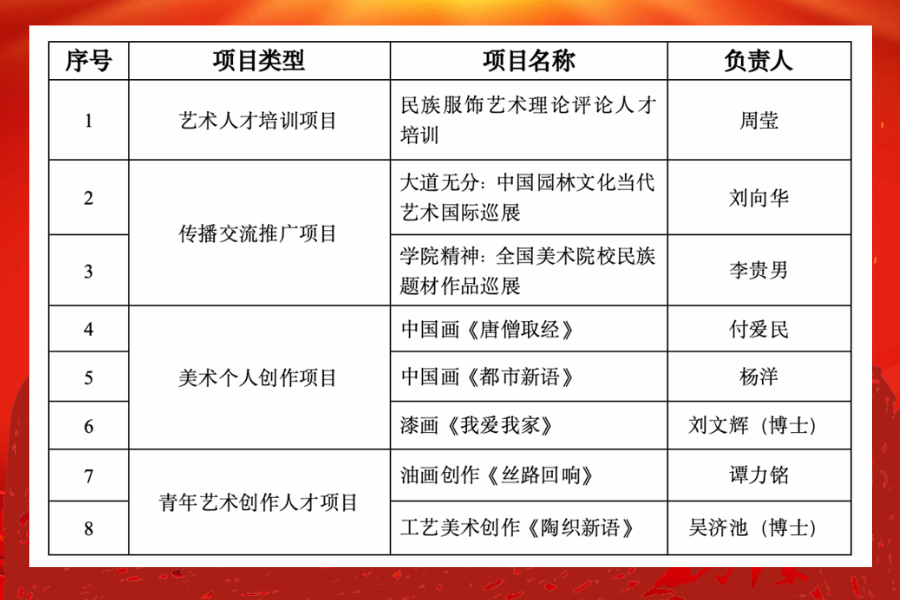新闻网讯 近日,国家艺术基金(一般项目)2025年度资助项目名单公布,我校美术学院共有8个项目入选,包含艺术人才培训项目1项、传播交流推广项目2项、美术个人创作项目3项、青年艺术创作人才项目2项,创美术学院历史新高。