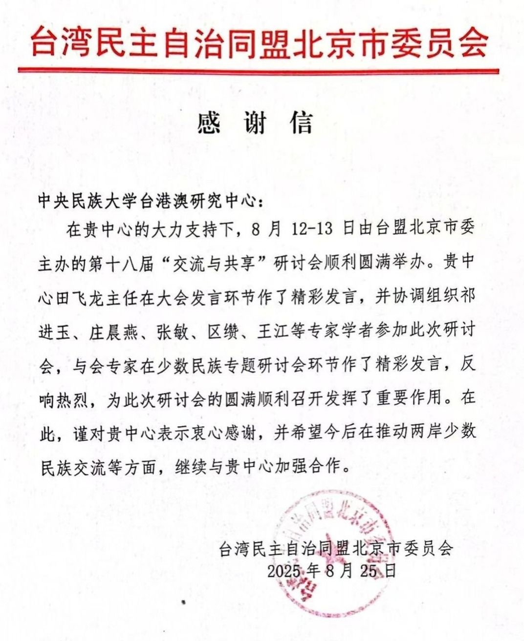 主办方台盟北京市委对ag真人试玩台港澳研究中心的协办工作及民大学者的参会贡献给予高度肯定,并表达了对继续深化机构合作与推动两岸少数民族交流及国家统一进程的积极意愿。