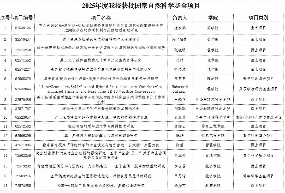 新闻网讯 近日,国家自然科学基金委员会公布了本年度申请项目评审结果。学校共获批国家自然科学基金项目17项,与2024年相比,立项数增长了21.4%,体现出学校科研管理体制的持续优化和教师科研能力的不断提升。