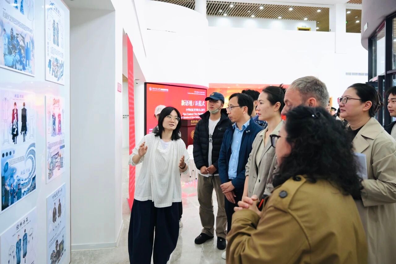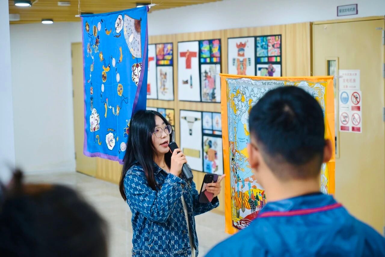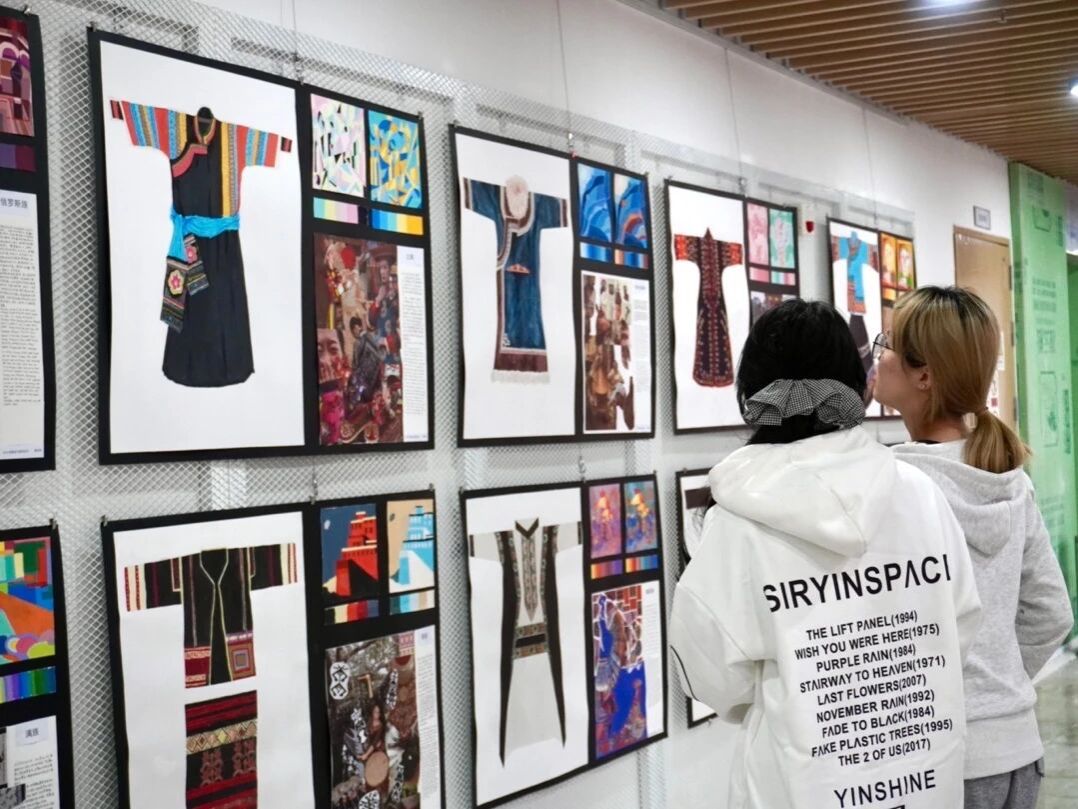 展览开幕式后,服装与服饰设计专业教师肖敬、王苒对本次展览内容及教学开展情况进行了详细介绍。在《设计色彩》课程展示区域,学生围绕中国各地区民族服饰的色彩结构、图案语言、工艺细节与文化象征等方面进行描绘,展现了中华民族服饰美学与设计色彩研究的系统性。在《民间艺术》课程展示区域,作品结合本土植物资源,以蜡缬、绞缬、夹缬等传统技法为基础,呈现材料实验成果与可持续设计理念。此外,展览还包括实物作品、设计手稿、材料档案、实验过程与设计文本等内容,整体构建起“传统—当代—未来”的中华民族美学多维叙事体系。