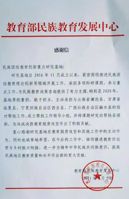 新闻网讯 近日,我校民族学与社会学学院中国民族理论与民族政策研究院民族团结教育创新重点研究基地收到教育部民族教育发展中心感谢信。信中对基地成立以来在民族教育决策咨询、教育脱贫攻坚以及其他工作方面所做的积极贡献表示感谢。