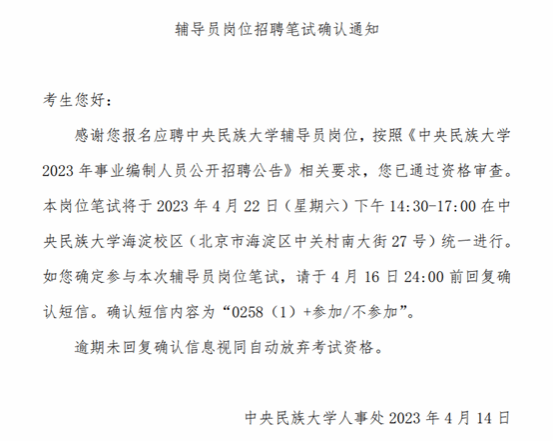 通过资格审查人员将于2023年4月15日上午10:00收到统一短信通知,内容如下图: