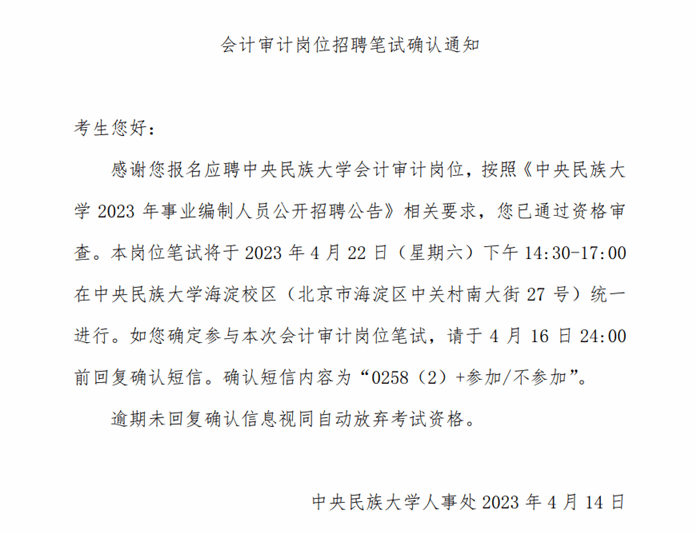 收到短信通知人员请务必确定是否参加笔试,并按短信要求于4月16日24:00前回复确认信息。逾期未回复确认信息视同自动放弃考试资格。