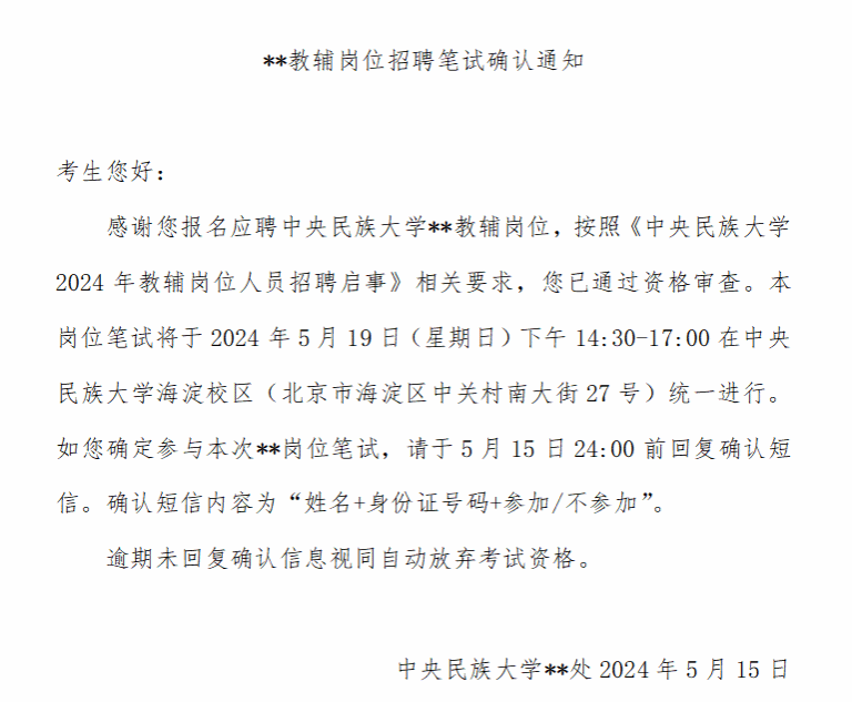 通过资格审查人员将于2024年5月15日下午15:00收到统一短信通知,内容如下图: