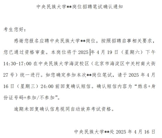 通过资格审查人员将于2025年4月16日(星期三)下午15:00收到统一短信通知,内容如下图: