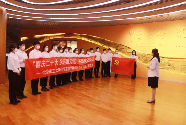 北京化工大学化学工程学院北区第三党支部在昌平校区校史馆开展“喜庆二十大 永远跟党走”主题党日活动,深入学习党的二十大精神。活动依托支部品牌栏目“北化青年说”,聚焦“喜庆二十大 永远跟党走”主题,采用教师引导、学生讲述、情景体验、师生互动等多种形式,结合校史馆鲜活的实物展览,通过讲述学校发展故事、北化奉献故事、青春奋斗故事,持续激发青年党员立志做有理想、敢担当、能吃苦、肯奋斗的新时代好青年。