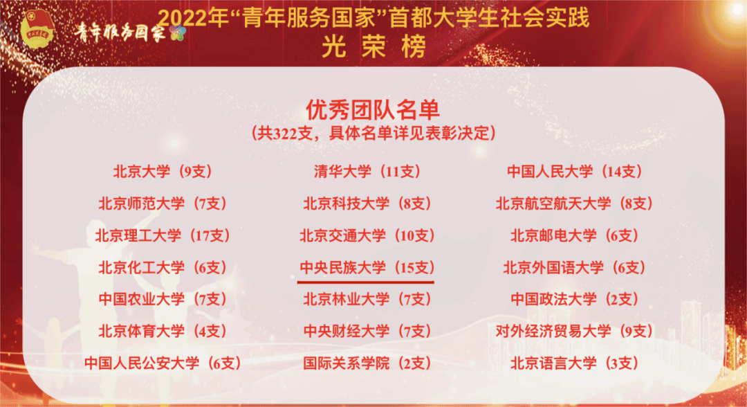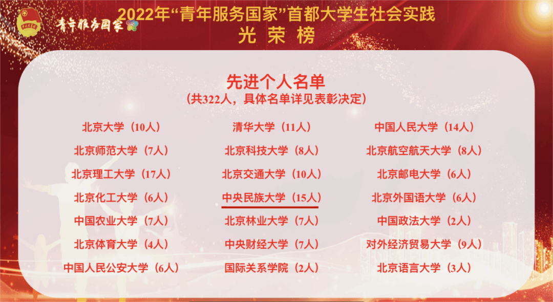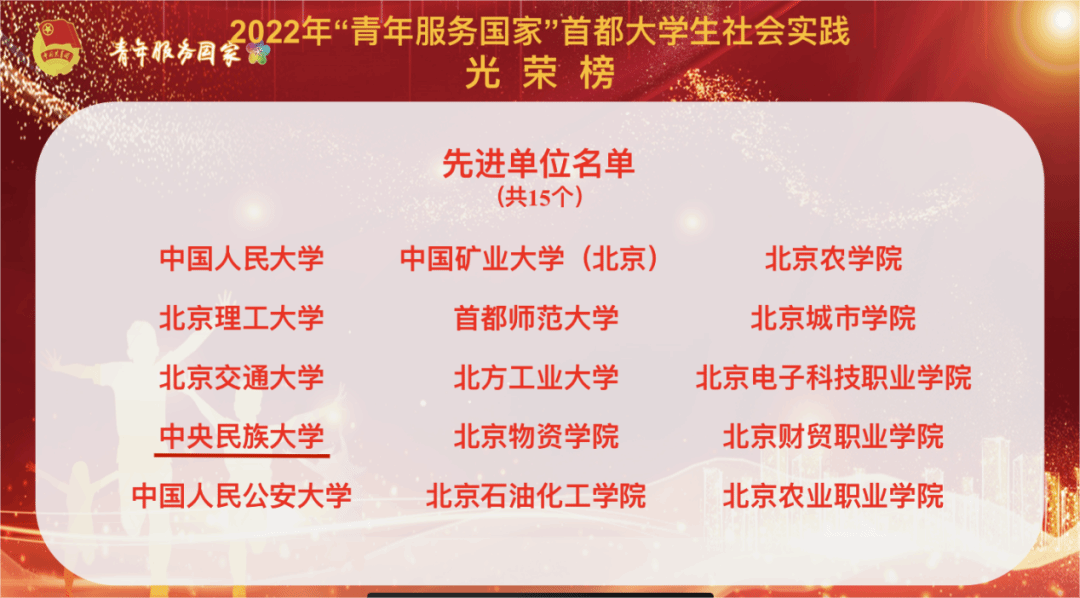 在表彰决定中,ag真人试玩荣获“2022年首都大学生社会实践先进单位”,赴青海省西宁市调研三农教育公益服务实践团等15个团队荣获“2022年首都大学生社会实践优秀团队”;陈钧、张继伟、刘昌翠等15位教职工获评“2022年首都大学生社会实践先进工作者”;佳妮、李永霞、李文韬等15位师生获评“2022年首都大学生社会实践先进个人”。