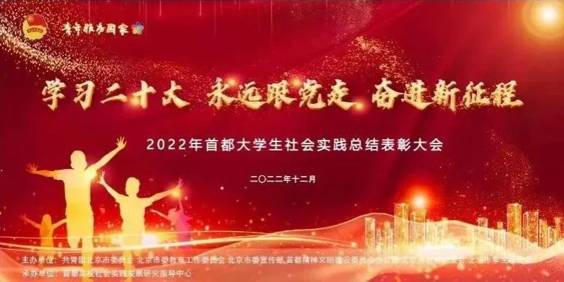 新闻网讯 为深入总结经验,做好典型宣传,激励广泛参与,发挥育人实效,引领广大首都青年学生在实践中受教育、长才干、做贡献,12月29日,共青团北京市委员会、北京市委教育工作委员会、北京市委宣传部、首都精神文明建设委员会办公室、北京市教育委员会和北京市学生联合会联合举办“学习二十大 永远跟党走 奋进新征程”2022年首都大学生社会实践活动总结表彰大会,大会对在2022年“青年服务国家”首都大学生社会实践活动中表现突出的集体和个人进行表彰。