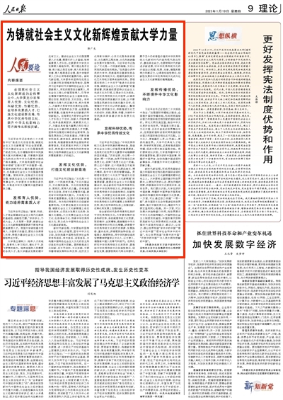 新闻网讯 1月19日,《人民日报》“人民要论”栏目刊发我校党委副书记、校长郭广生署名文章《为铸就社会主义文化新辉煌贡献大学力量》,文章指出,在铸就社会主义文化新辉煌的宏伟事业中,大学要充分发挥育人优势、文化优势、科研优势、传播优势,在培养高素质人才、打造文化建设新高地、传承中华优秀传统文化、提升中华文化影响力等方面作出积极贡献。全文内容如下: