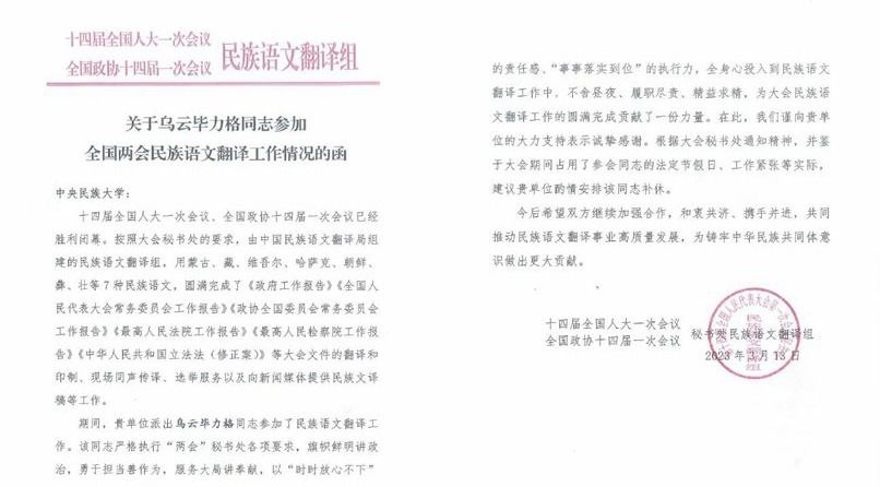 会议期间,乌云毕力格参加了大会文件的民族语文翻译及现场同声传译工作,严格执行两会秘书处各项要求,全身心投入到民族语文翻译工作中,旗帜鲜明讲政治,勇于担当善作为,服务大局讲奉献,不舍昼夜、履职尽责、精益求精,为大会民族语文翻译工作的圆满完成贡献了力量。大会闭幕后,全国两会秘书处民族语文翻译组向学校发函,充分肯定乌云毕力格同志在此次两会民族语文翻译工中的优异表现,并对学校长期以来对两会民族语文翻译工作的大力支持表示感谢,希望今后双方继续加强合作,和衷共济、携手并进,共同推动民族语文翻译事业高质量发展,为铸牢中华民族共同体意识作出贡献。