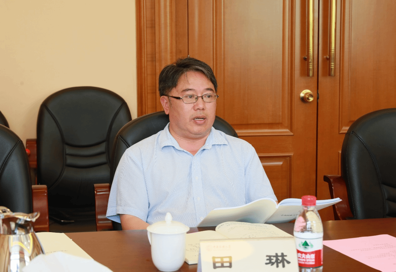 ▲学校主题教育领导小组办公室调研组组长马国伟,党委教师工作部部长、人事处处长杜林交流发言