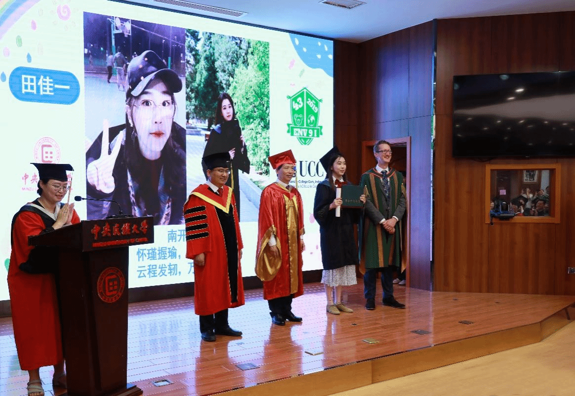 典礼在班主任杨婷老师充满感情和深情的介绍每一位学生的学业情况中迎来了的高潮,每一位学生接受郭广生颁发的学位证并拨正流苏,接受李计勇颁发的ag真人试玩毕业证,接受马库斯·艾奇霍恩颁发的UCC学业证明。每位毕业生接过的是自己四年努力的“证明书”,是通向未来的“通行证”,是自己继续前行的动力源……