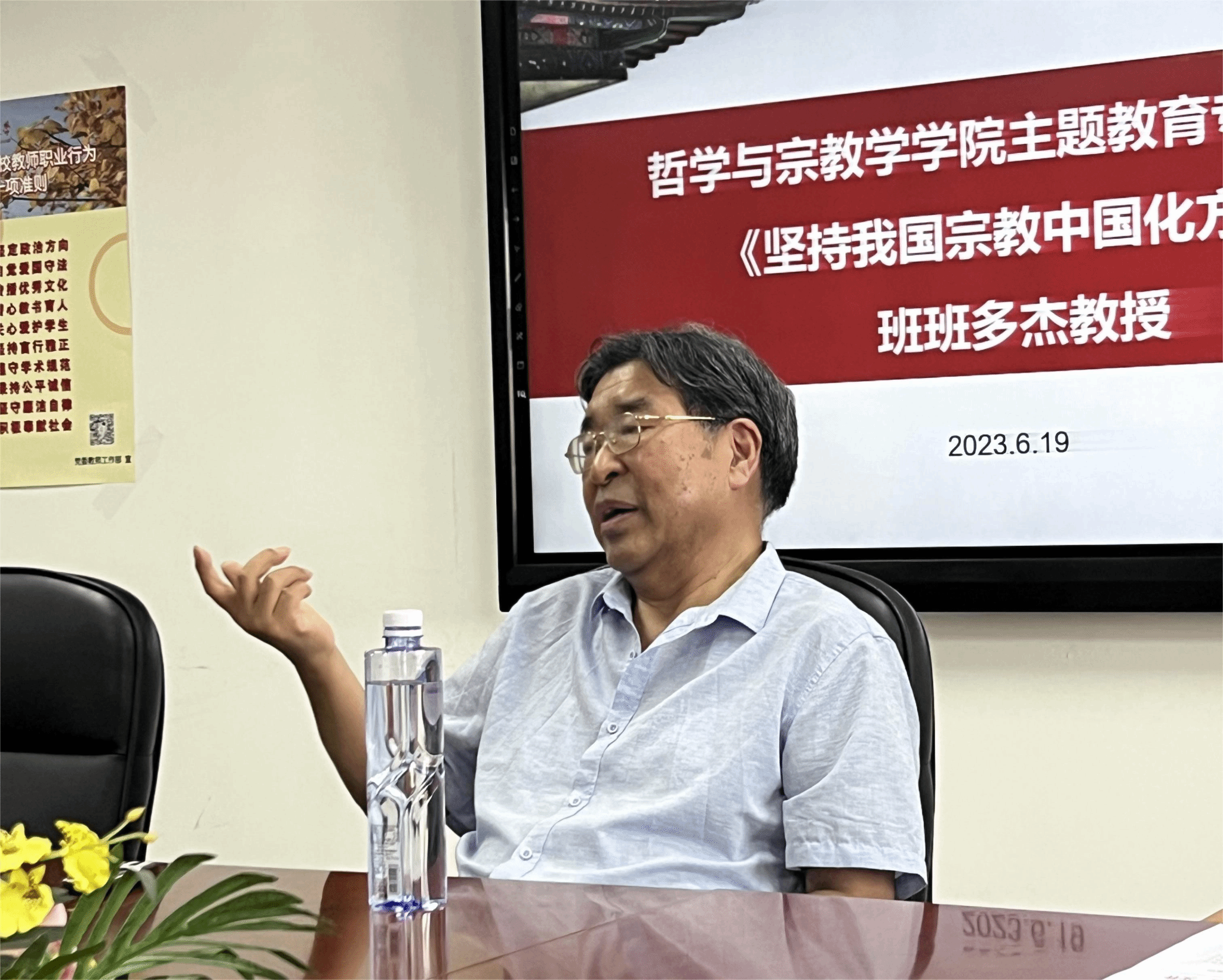 6月19日,学院邀请班班多杰教授作《坚持我国宗教中国化方向》的主题报告,报告指出,坚持宗教中国化既是学术热点,也是党和国家关心的重大战略问题。学院教师们感慨,老一辈学人所开创的学术传统浸润着深厚的哲学智慧,这值得我们继续加以坚持和发展。