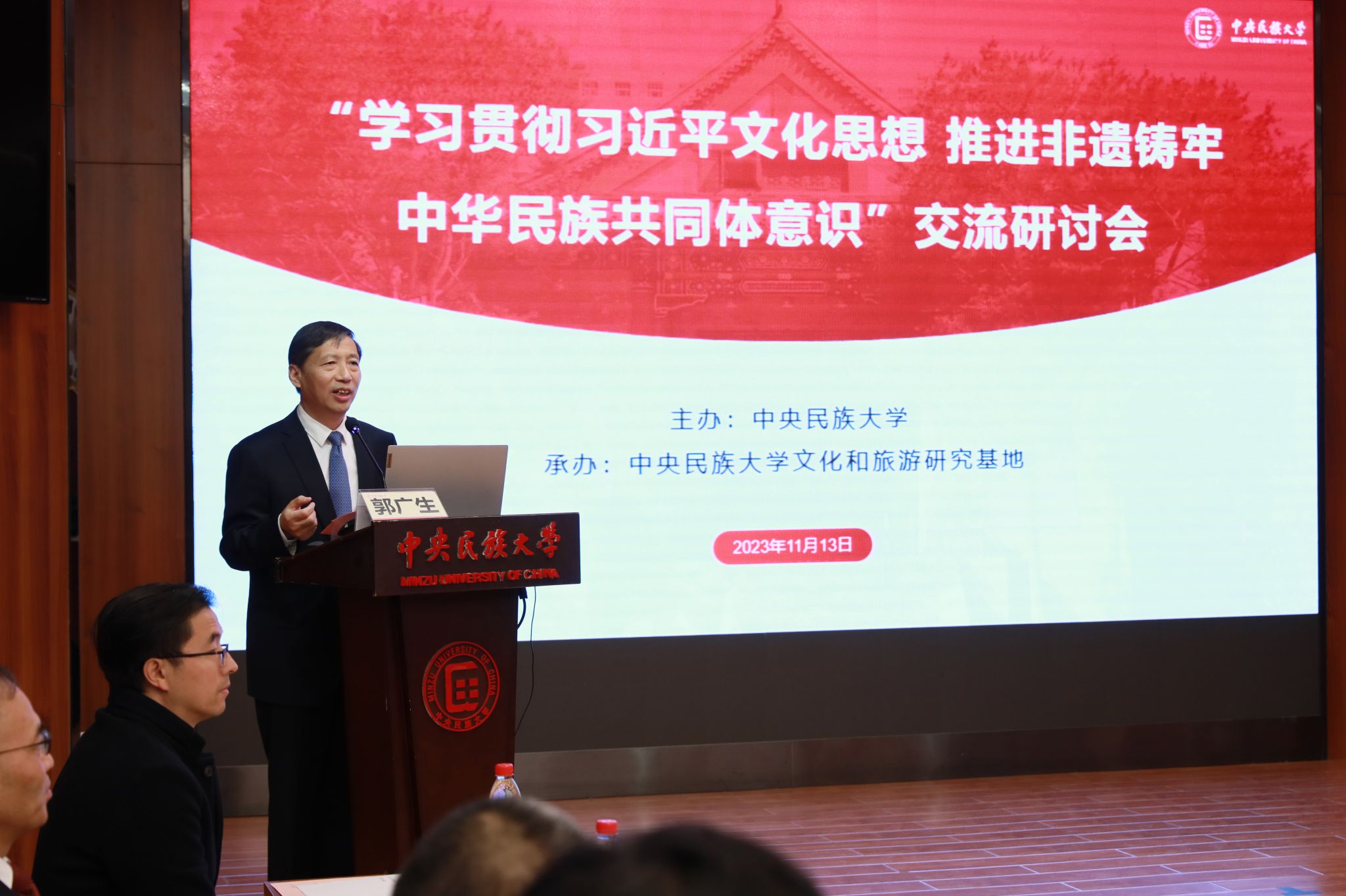 郭广生指出,此次交流研讨会,是贯彻落实党的二十大精神和习近平总书记在中央政治局第九次集体学习重要讲话精神的举措之一,对于推动马克思主义原理同中国实际、同中华优秀传统文化相结合,通过非物质文化遗产铸牢中华民族共同体意识,建设中华民族现代文明具有重要意义。郭广生表示,学校高度重视中华优秀传统文化传承发展、弘扬传播工作,积极推进非遗保护与旅游融合发展,尤其在我国各民族优秀文化的研究阐释、传承传播、创新发展等方面取得成果丰硕。文化和旅游部也多次委托学校在非物质文化遗产传承发展、非物质文化遗产蕴含的中华文化基因、非物质文化遗产知识产权保护等方面开展重要课题研究,这些都构成了“文化和旅游研究基地”的工作内容和传统特色。
