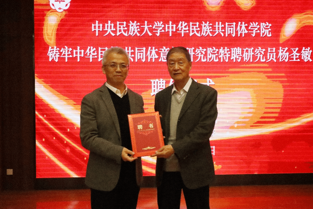讲座开始前,强世功向杨圣敏教授颁发了中华民族共同体学院、铸牢中华民族共同体意识研究院特聘研究员聘书。