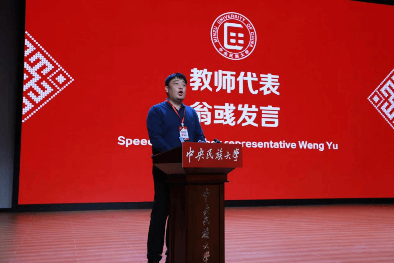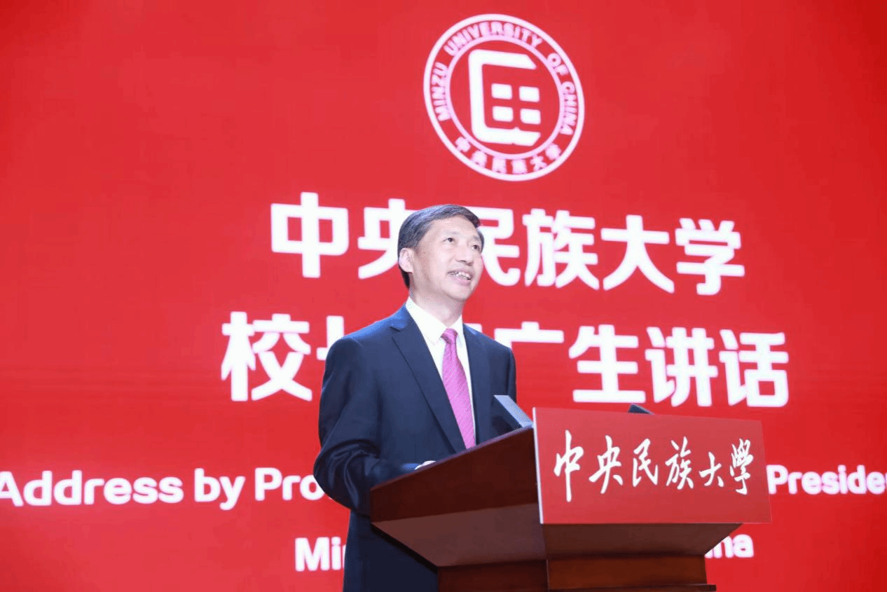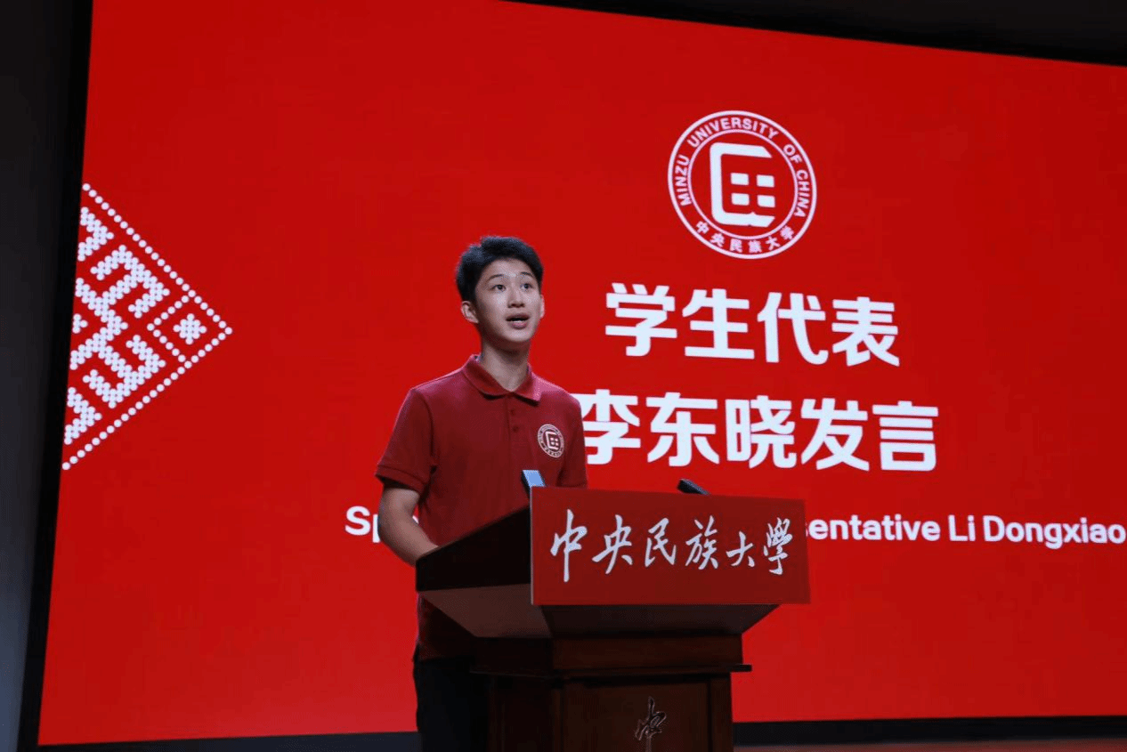 新生代表李东晓在发言中号召各民族青年学子在民大交往交流交融,共同学习实践,共同成长进步,让民大的未来更加熠熠生辉。