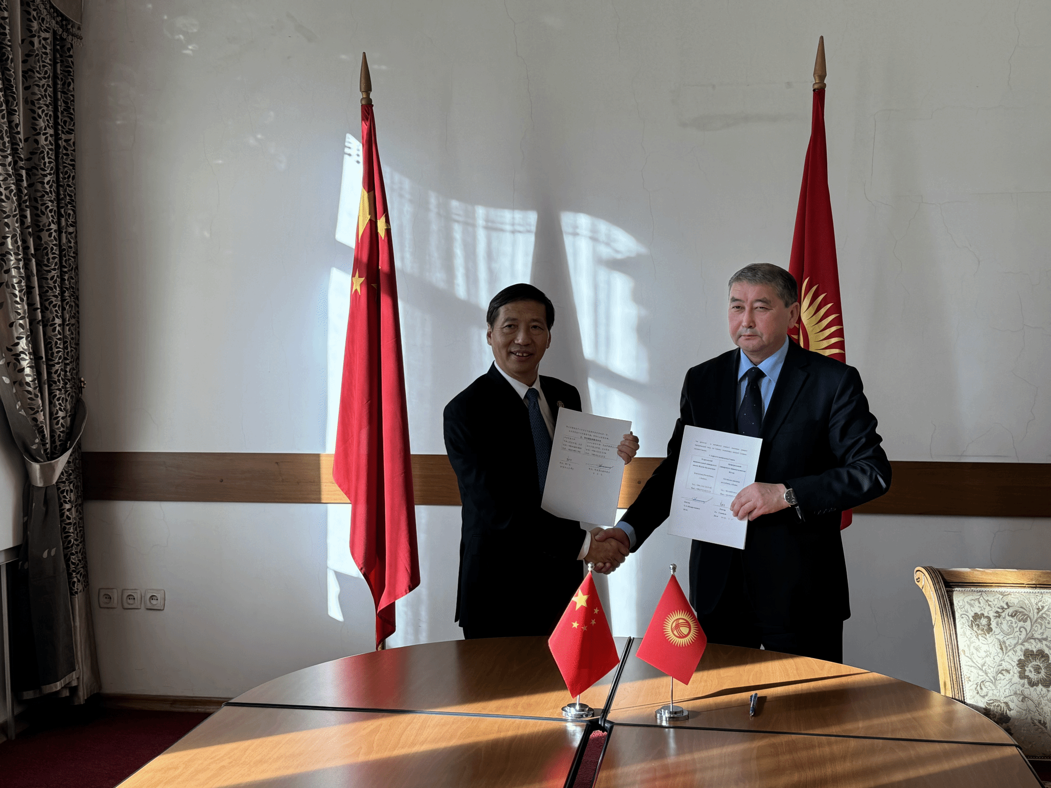 随后在吉尔吉斯斯坦,代表团访问了朱苏普·巴拉萨根国立大学,该校校长托罗别克·阿波德拉赫玛诺夫教授、国际处处长、新闻处处长、孔子学院外方院长等会见代表团一行。双方同意扩大学生交换项目、加强教师交流互访,并希望联合中国相关高校,充分利用中吉学院、孔子学院等平台,在加深两校合作的同时,推进两国高校间、城市间、国家间的人文交流。两校校长签署了合作框架协议。