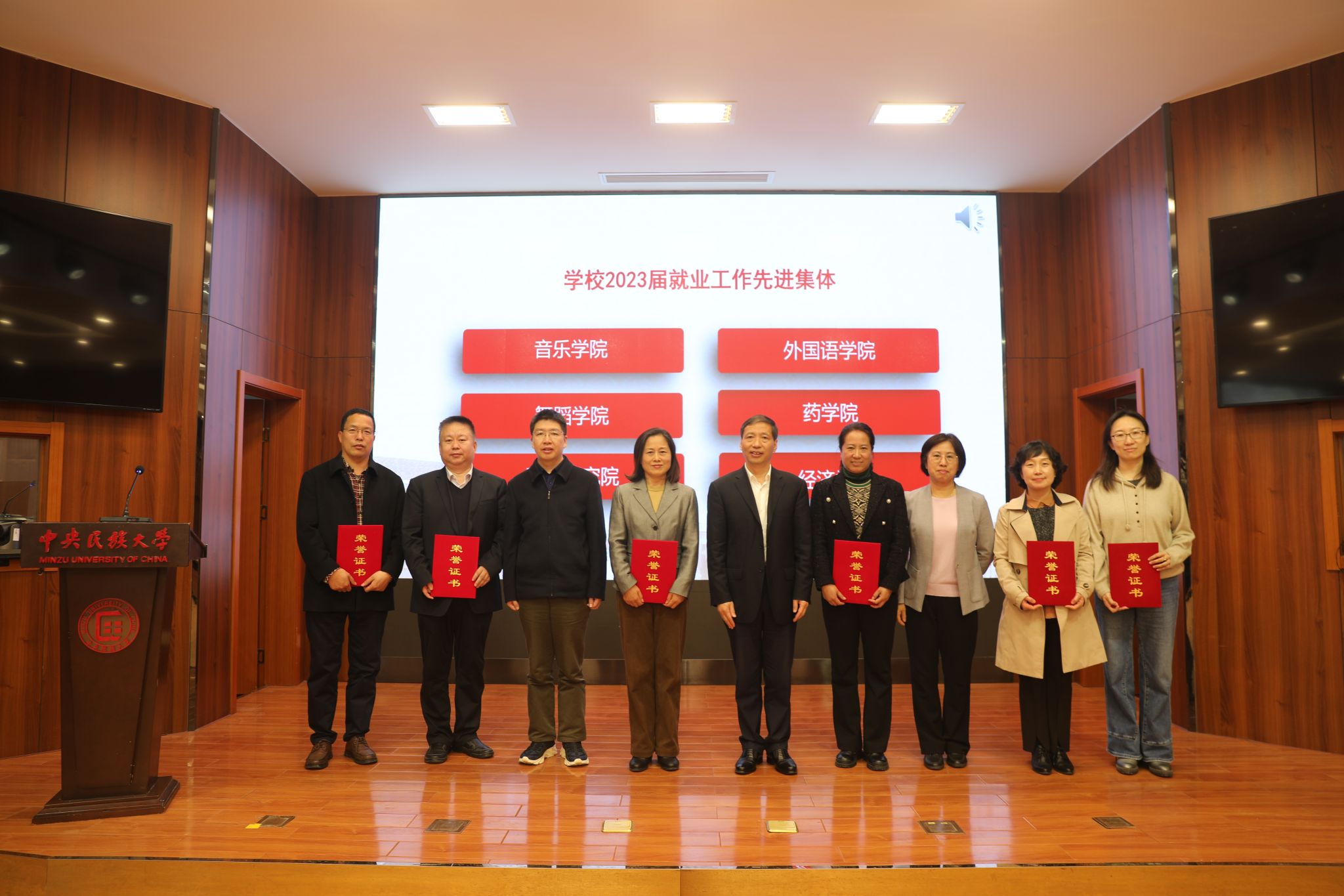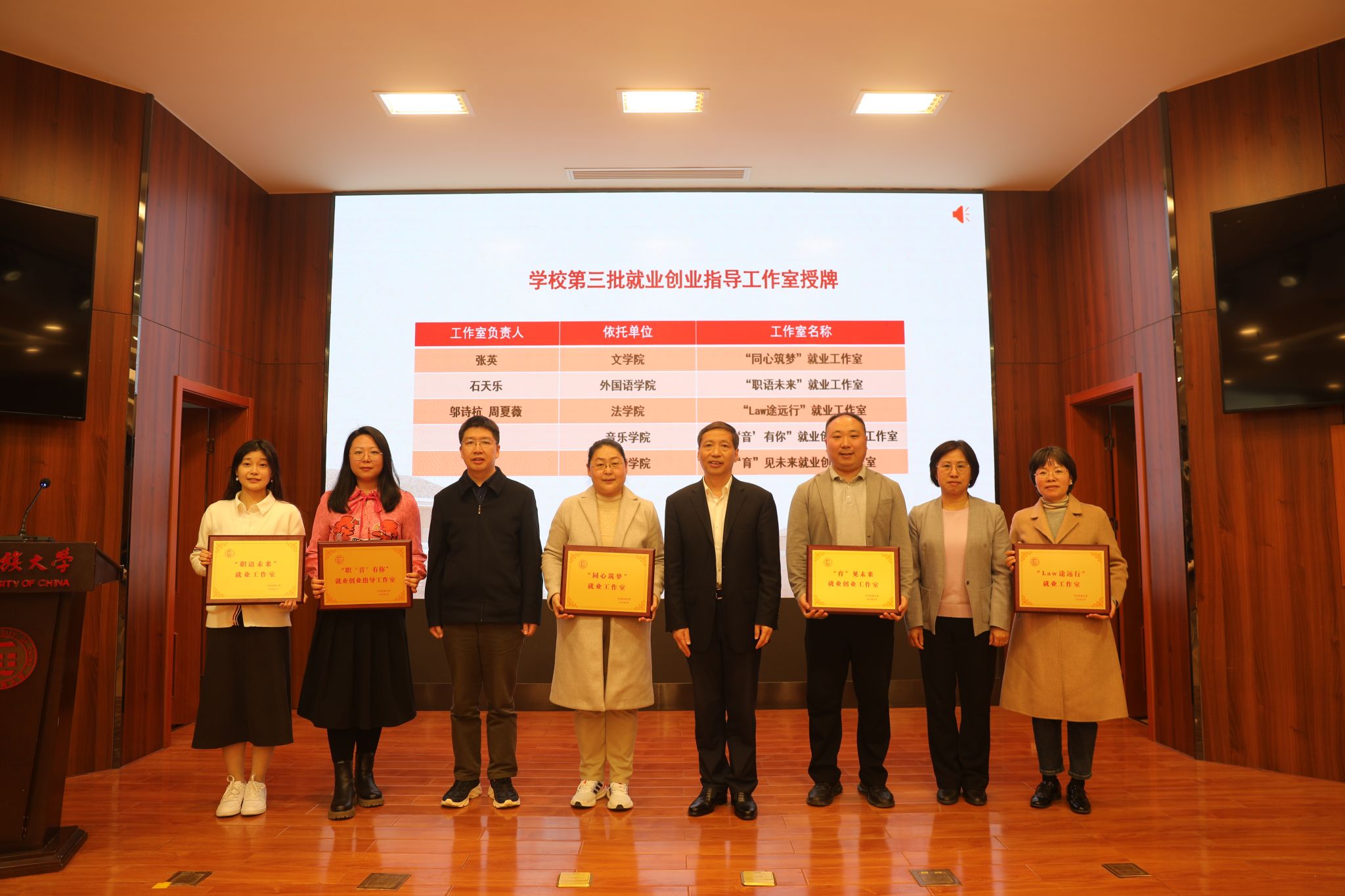 郭广生、王丽萍、杨慕云为学校2023届就业工作先进集体颁发荣誉证书,为第三批就业创业指导工作室集中授牌。