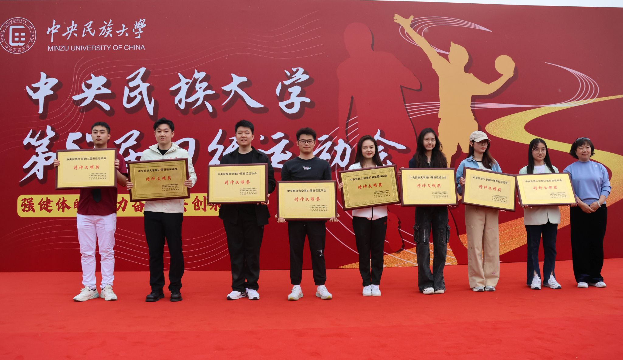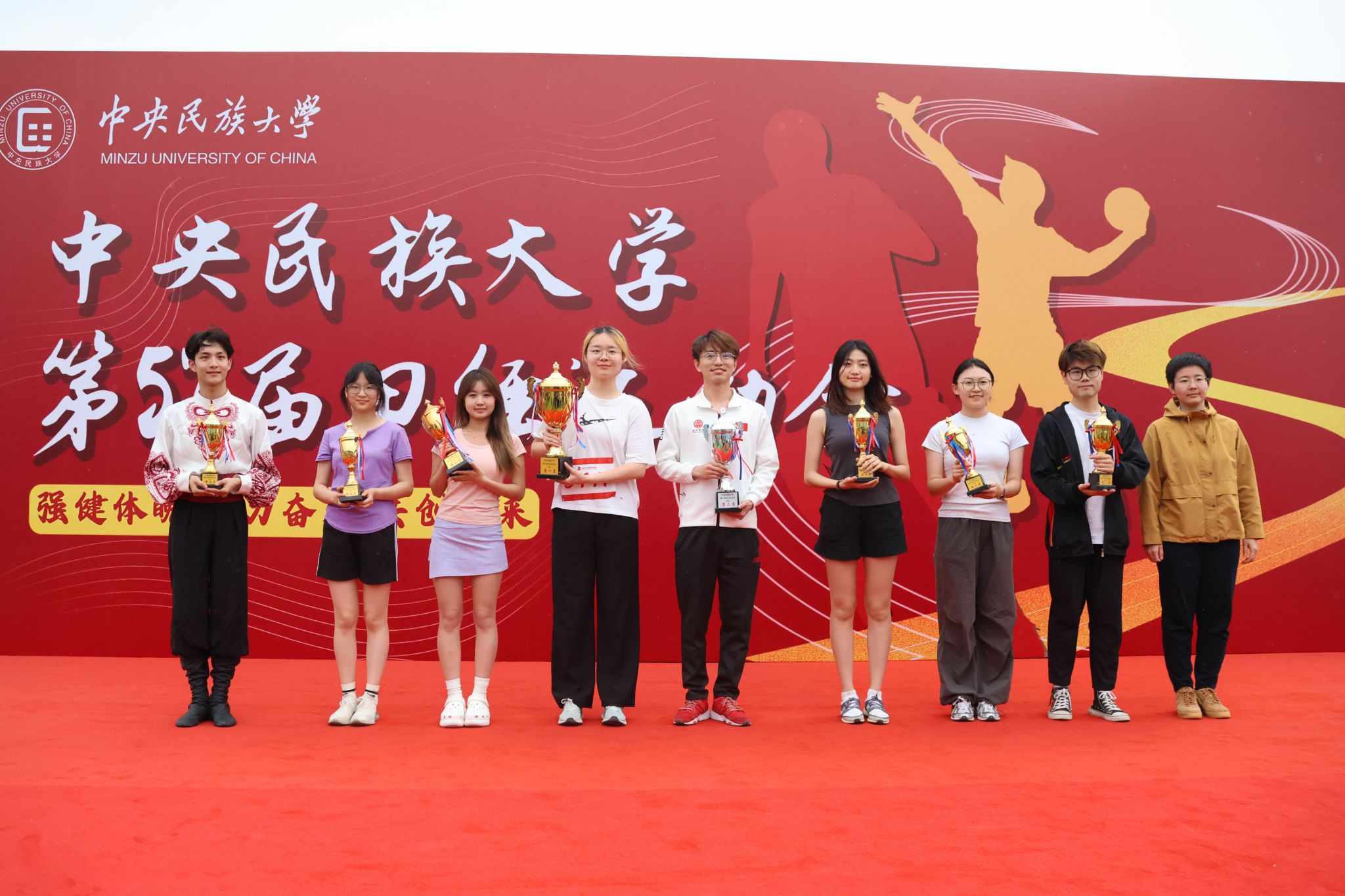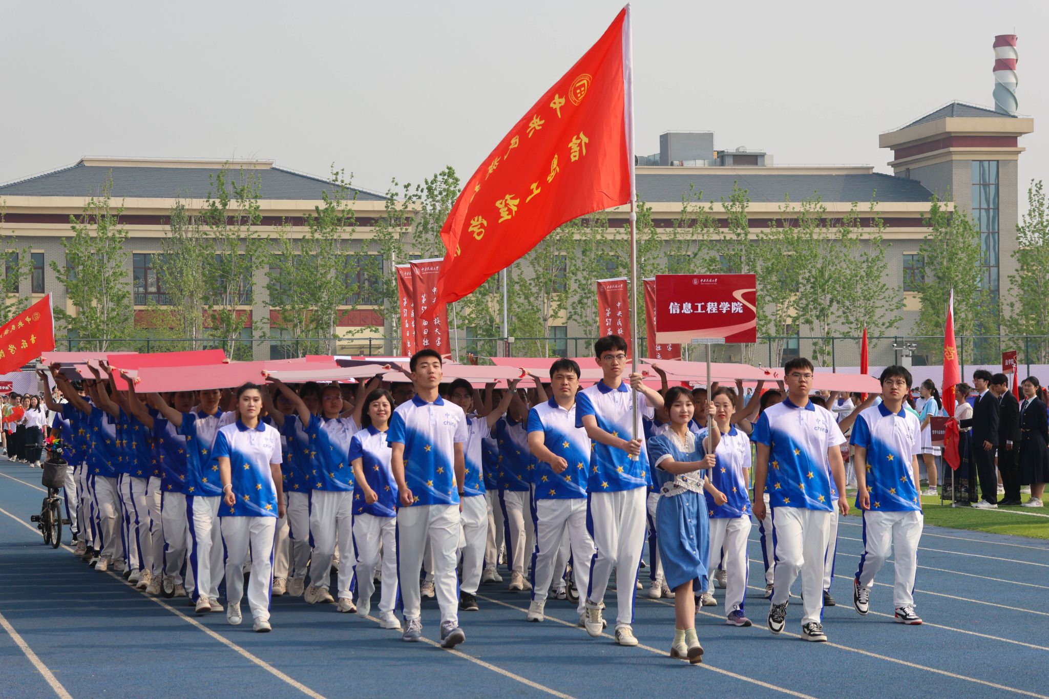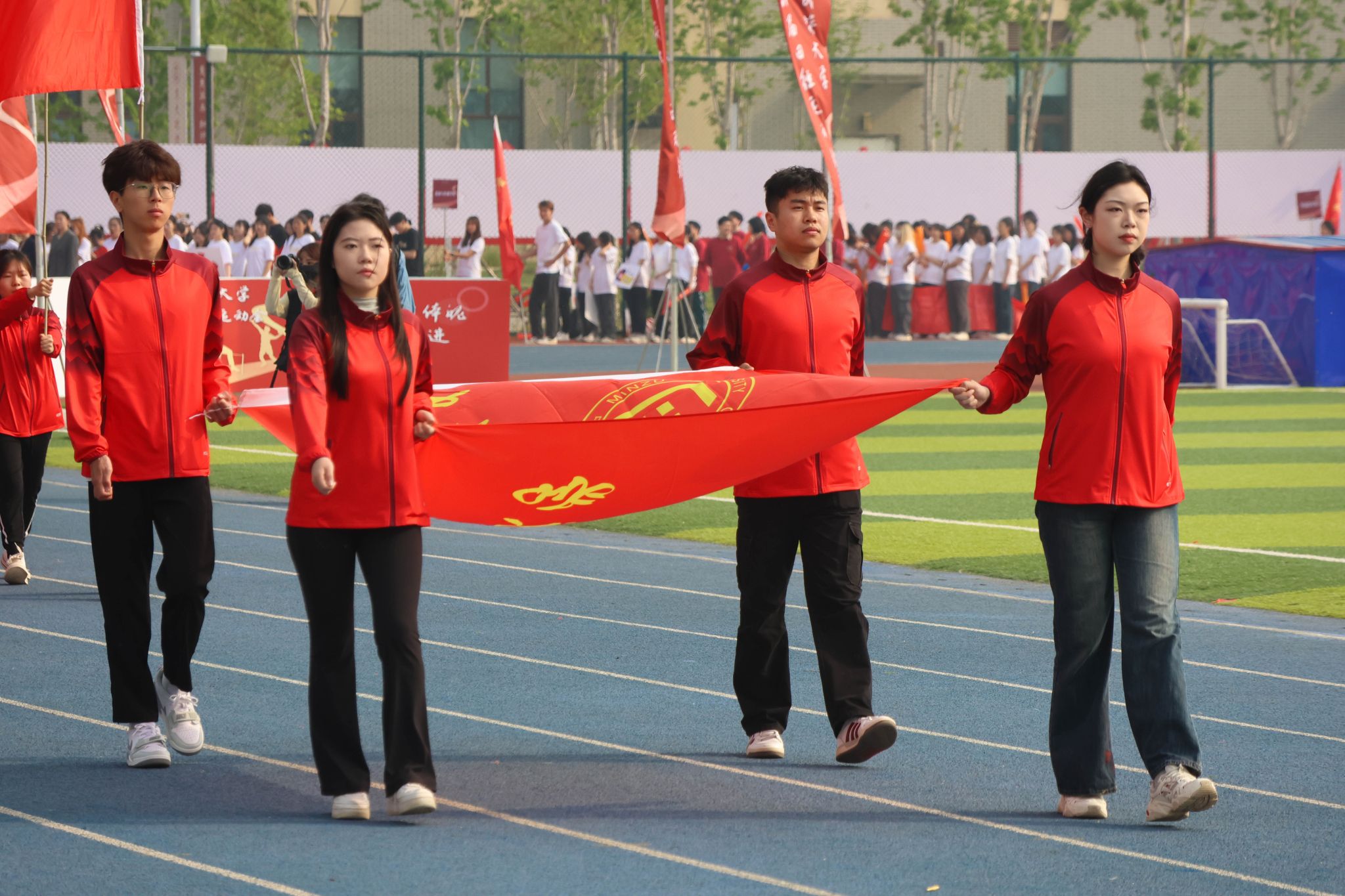 本届运动会的主题为“强健体魄 聚力奋进 共创未来”。在开幕式现场,国旗队、校旗队、红旗队、裁判员方队、各学院运动员代表方队、教职工运动员代表方队等各方阵依次入场。他们排着整齐的队伍,朝气蓬勃、昂首阔步、口号铿锵、意气风发地走过看台。“开弓搭腕并步抱拳”“春风得意正少年”,当音乐响起,国风舞蹈、八段锦、太极等精彩表演奏响了春日旋律,舞出了青春活力,更彰显了民大学子自觉铸牢中华民族共同体意识,传承与弘扬中华优秀传统文化的责任担当。