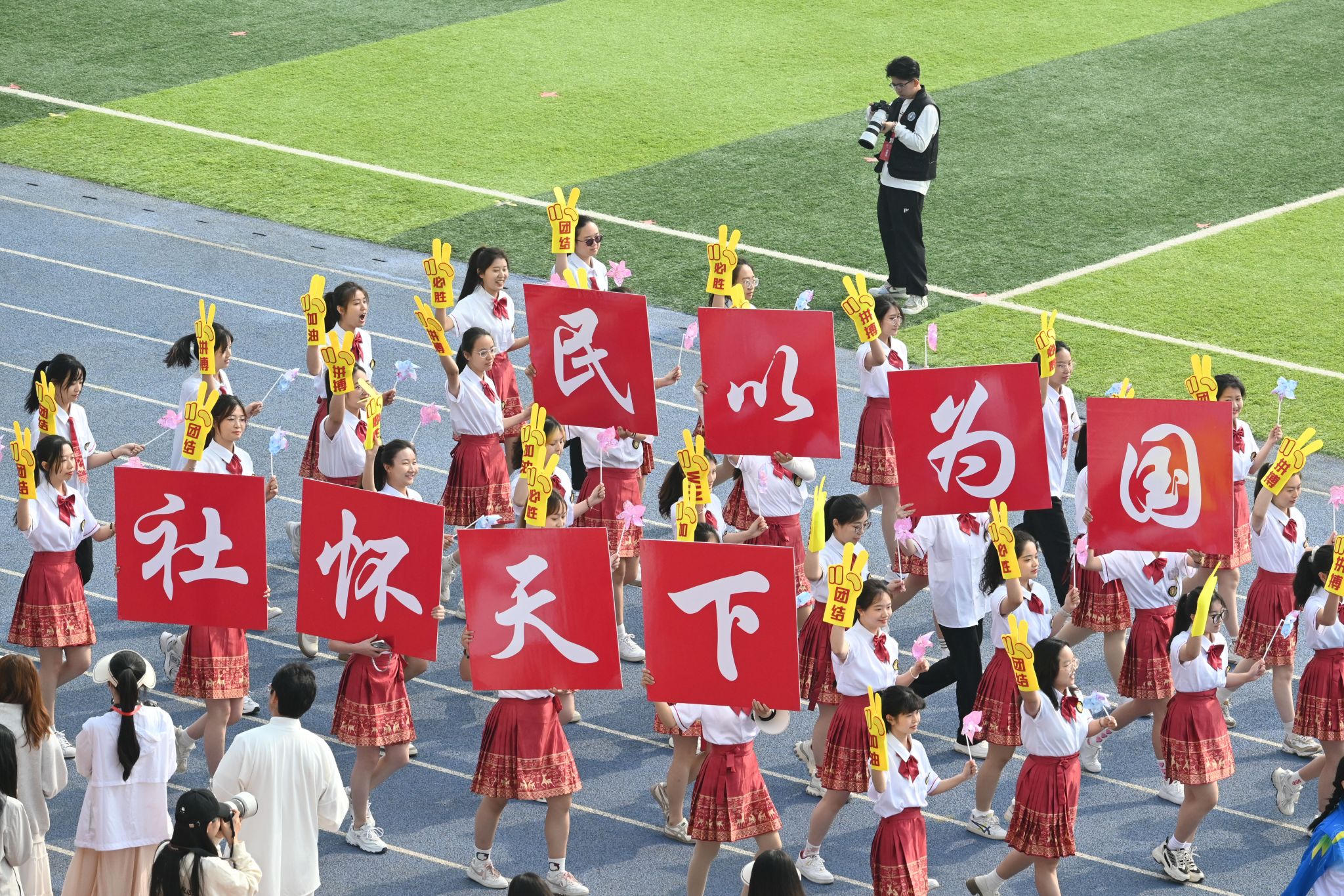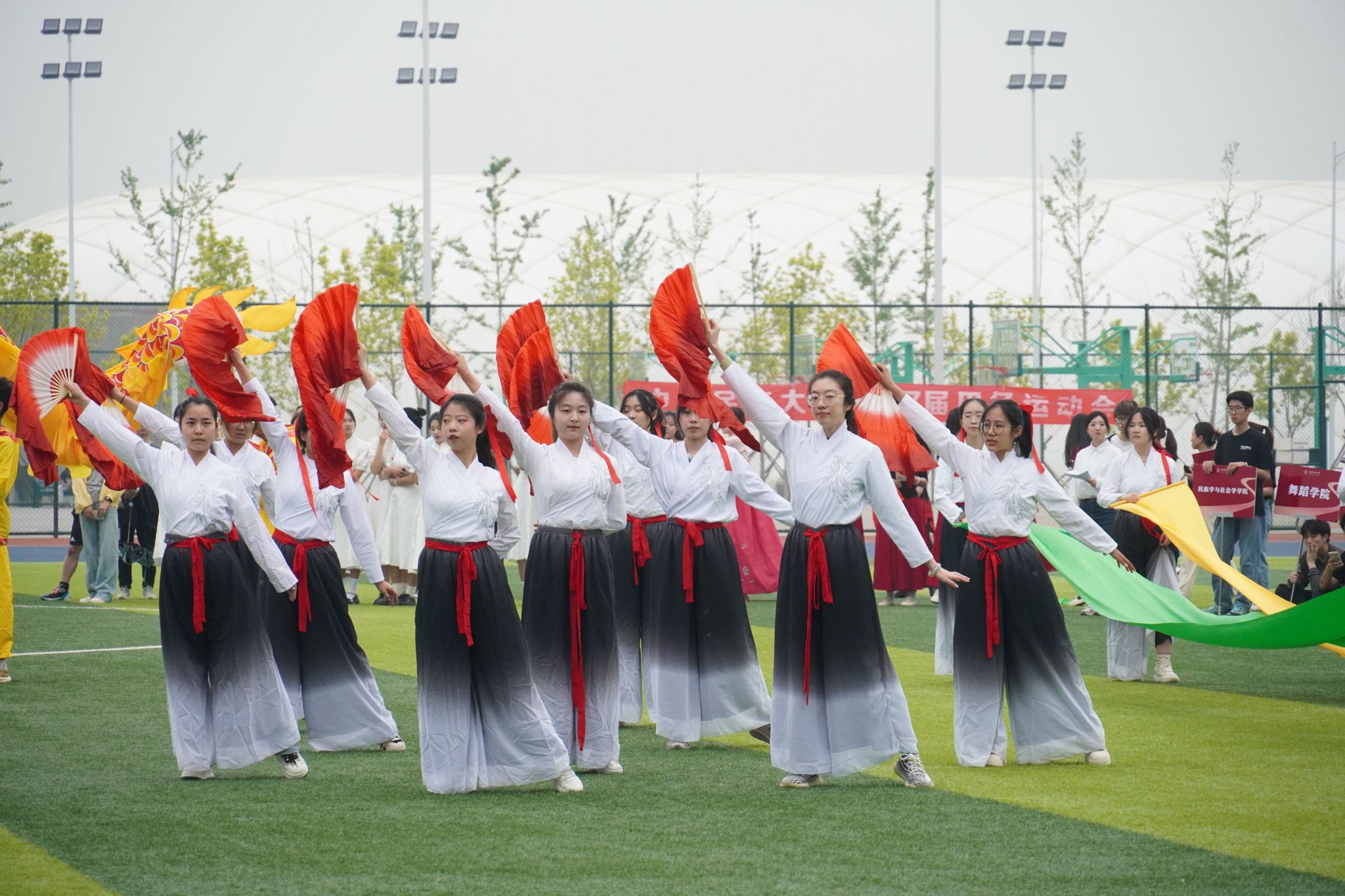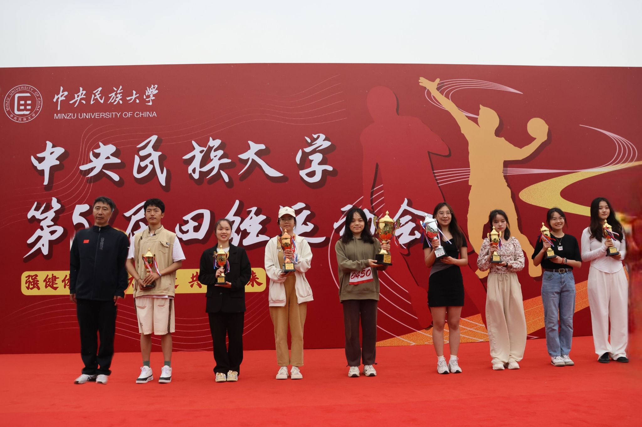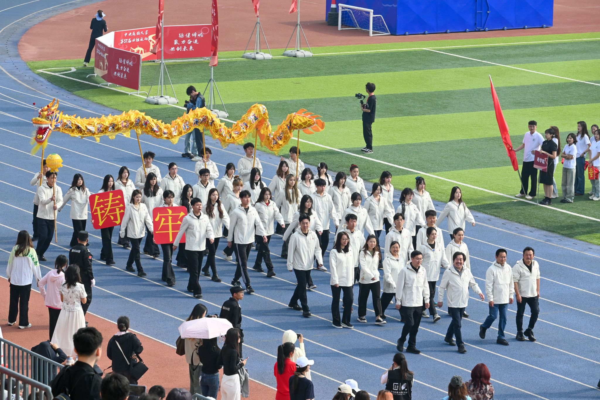本届运动会的主题为“强健体魄 聚力奋进 共创未来”。在开幕式现场,国旗队、校旗队、红旗队、裁判员方队、各学院运动员代表方队、教职工运动员代表方队等各方阵依次入场。他们排着整齐的队伍,朝气蓬勃、昂首阔步、口号铿锵、意气风发地走过看台。“开弓搭腕并步抱拳”“春风得意正少年”,当音乐响起,国风舞蹈、八段锦、太极等精彩表演奏响了春日旋律,舞出了青春活力,更彰显了民大学子自觉铸牢中华民族共同体意识,传承与弘扬中华优秀传统文化的责任担当。
