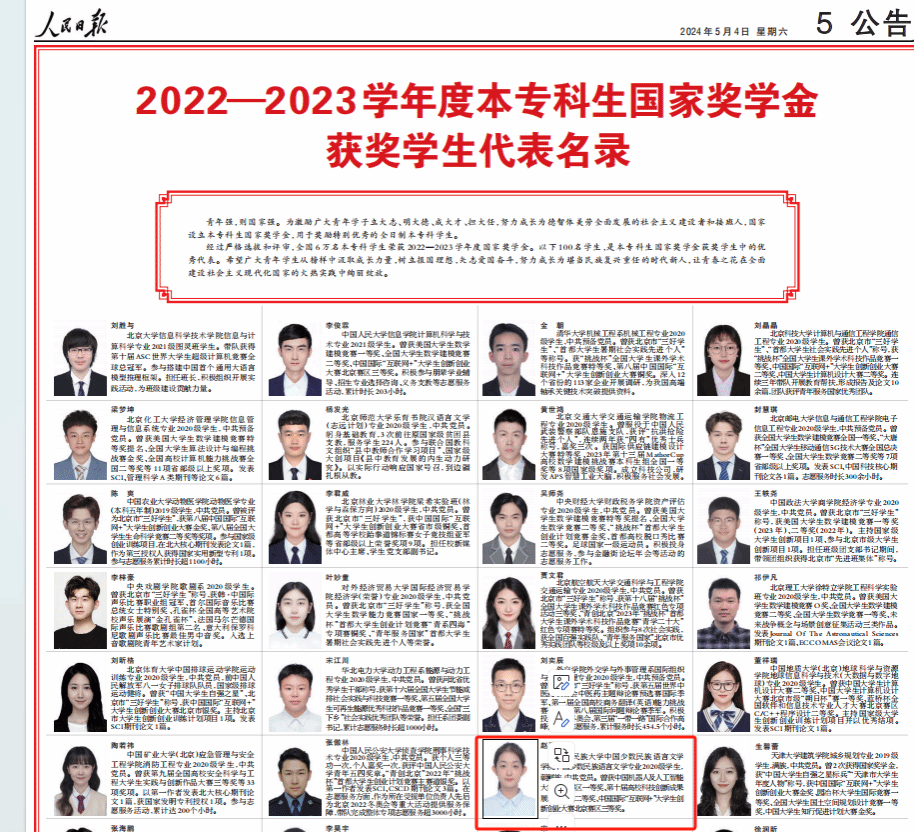 新闻网讯 5月4日,五四青年节之际,《人民日报》整版刊登了《2022—2023学年度本专科生国家奖学金获奖学生代表名录》,民大学子赵惠怡(中国少数民族语言文学学院 2020级本科生)脱颖而出,光荣上榜。