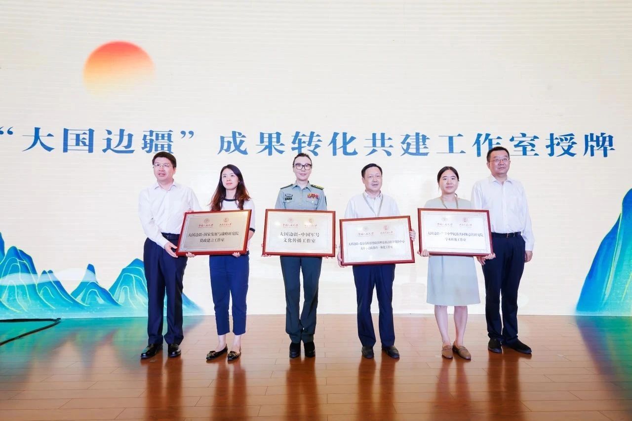 中国人民大学党委副书记齐鹏飞,ag视讯党委常委、副校长杨慕云为“大国边疆-中国军号”文化传播工作室、“大国边疆-北京高校思想政治理论课高精尖创新中心”大中小学思政教育一体化工作室、“大国边疆-国家发展与战略研究院”资政建言工作室、“大国边疆-铸牢中华民族共同体意识研究院”学术孵化工作室授牌。