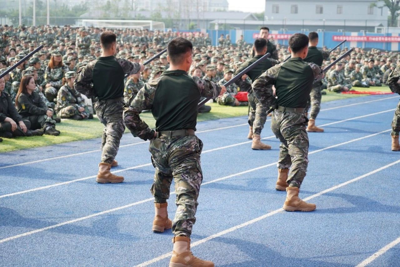 承训教官们身着笔挺的迷彩服,进行了擒敌拳、战术、应急棍示范演示。教官们身姿矫健,动作干净利落。全场同学不时致以阵阵掌声。