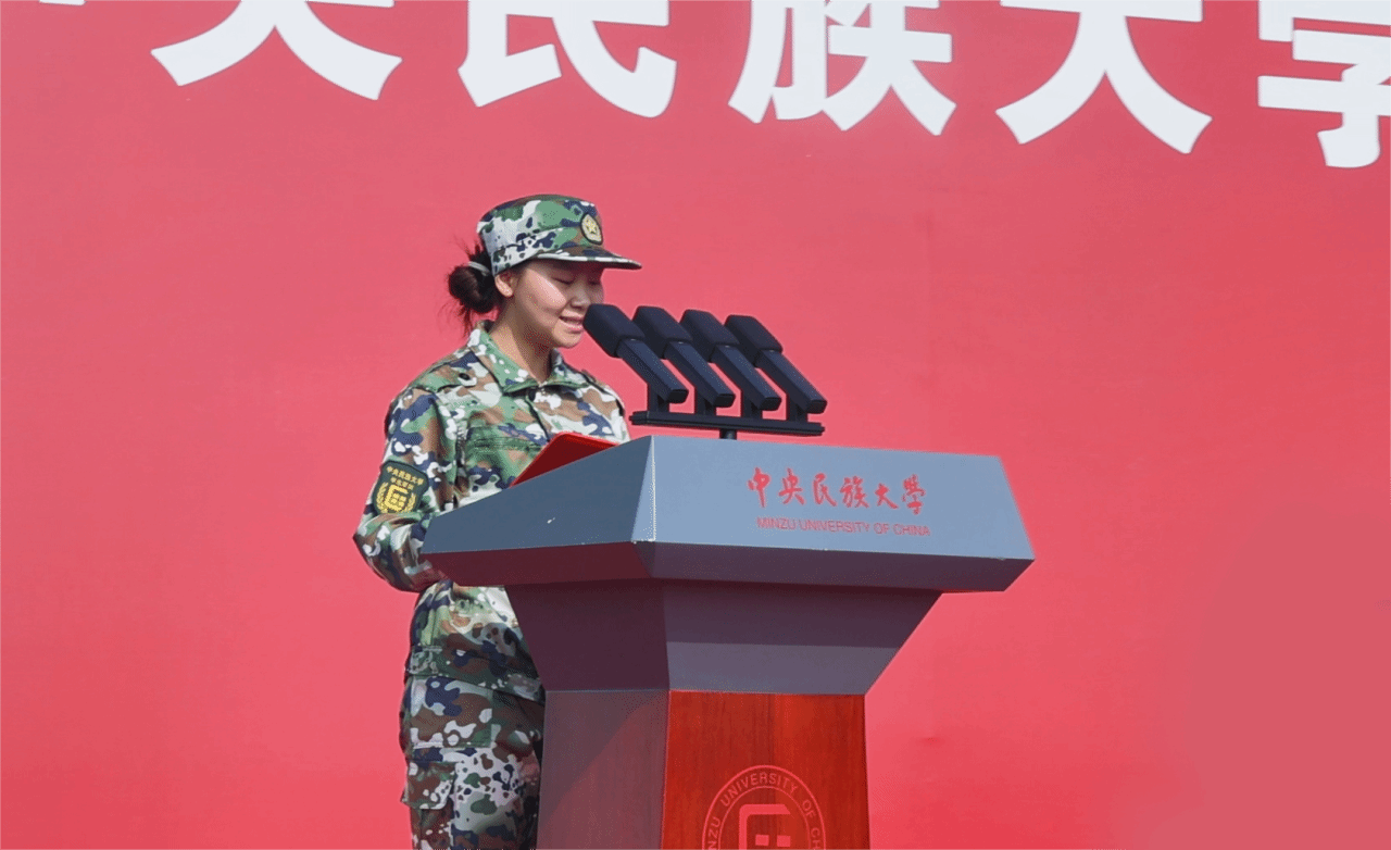 中国少数民族语言文学学院张雅慧作为参训学生代表发言,她号召同学们在军训中强身健体、磨练意志,发扬武警官兵光荣传统,锻造坚强意志,锤炼过硬作风,以实际行动在严格的训练中展现出民大人的精神风貌。