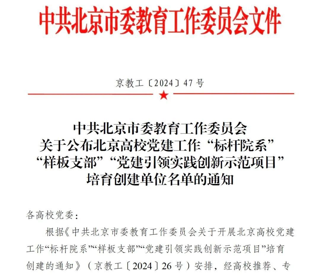 今年以来,学校党委深入实施基层党建工作质量提升工程,将党建示范创建和质量创优工作作为党建工作重点任务,坚持以“一融双高”为重点、对标“五个到位”创建培育“标杆院系”,以打造特色党支部工作法为重点、对标“七个有力”创建培育“样板支部”,继今年4月入选第四批“全国党建工作样板支部”和第三批“百个研究生样板支部”后,在北京市“双创”评选中再获佳绩。