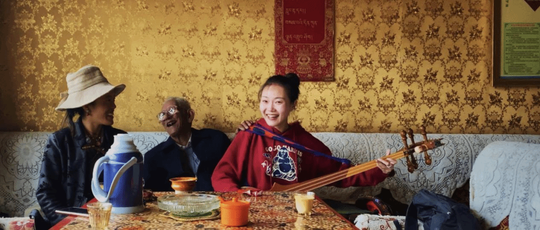 ▲在拉孜一个茶馆,陌生的老爷爷听陈嘉玮弹琴,初次见面,也如老友重逢。(图片来源:道中华)