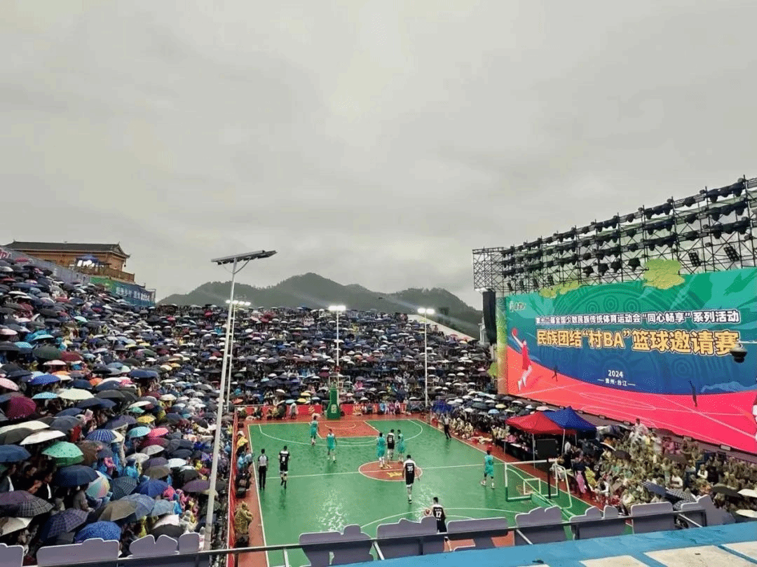 ▲2024年全国民族团结“村BA”篮球邀请赛期间,雨中的台盘乡篮球赛场。(图片来源:贵州省民宗委)