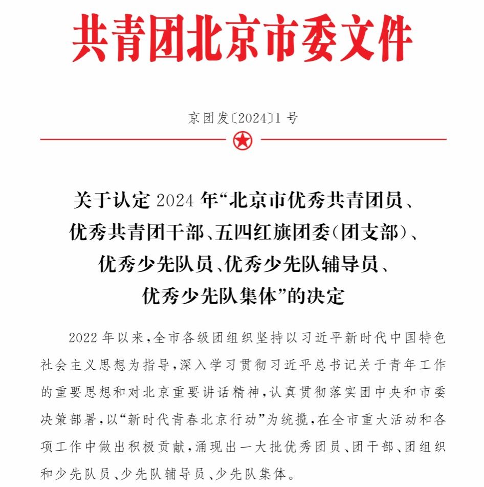 新闻网讯 近日,共青团北京市委员会正式公布了关于2024年“北京市优秀共青团员、优秀共青团干部、五四红旗团委(团支部)、优秀少先队员、优秀少先队辅导员、优秀少先队集体”认定结果,共青团ag视讯委员会被认定为2024年“北京市五四红旗团委”。