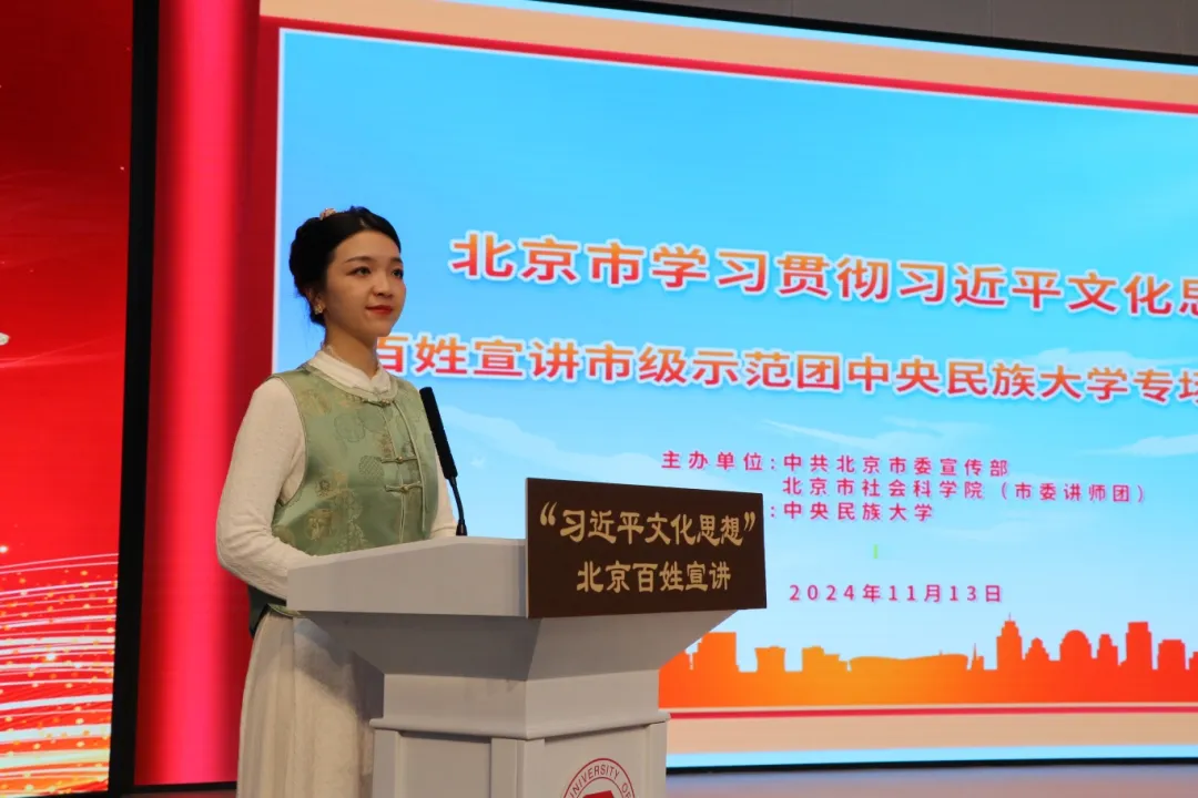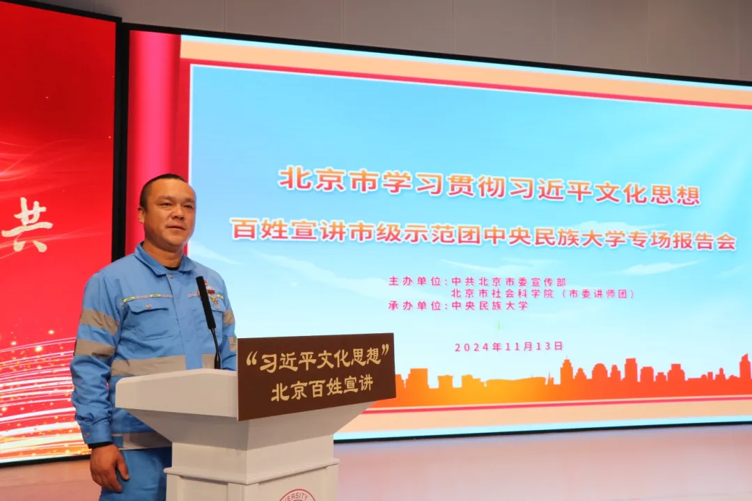 为深入学习宣传贯彻习近平文化思想和党的二十届三中全会精神,生动展现党的十八大以来全国文化中心建设取得的丰硕成果和习近平文化思想在首都的生动实践,在全国上下广泛深入开展党的二十届三中全会宣传宣讲和习近平文化思想正式提出一周年之际,11月13日下午,北京市学习贯彻习近平文化思想百姓宣讲市级示范团ag视讯专场报告会在丰台校区举行。马克思主义学院部分师生和校研究生会“石榴籽”计划学员一百余人聆听了报告会。