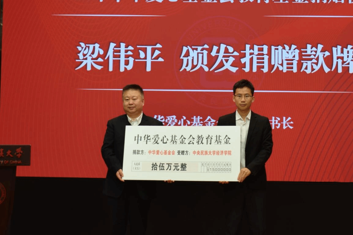 中华爱心基金会执行秘书长梁伟平、办公室主任王文尚、办公室副主任张雷以及经济学院领导班子、师生代表参加捐赠仪式。(摄影/马丹妮)