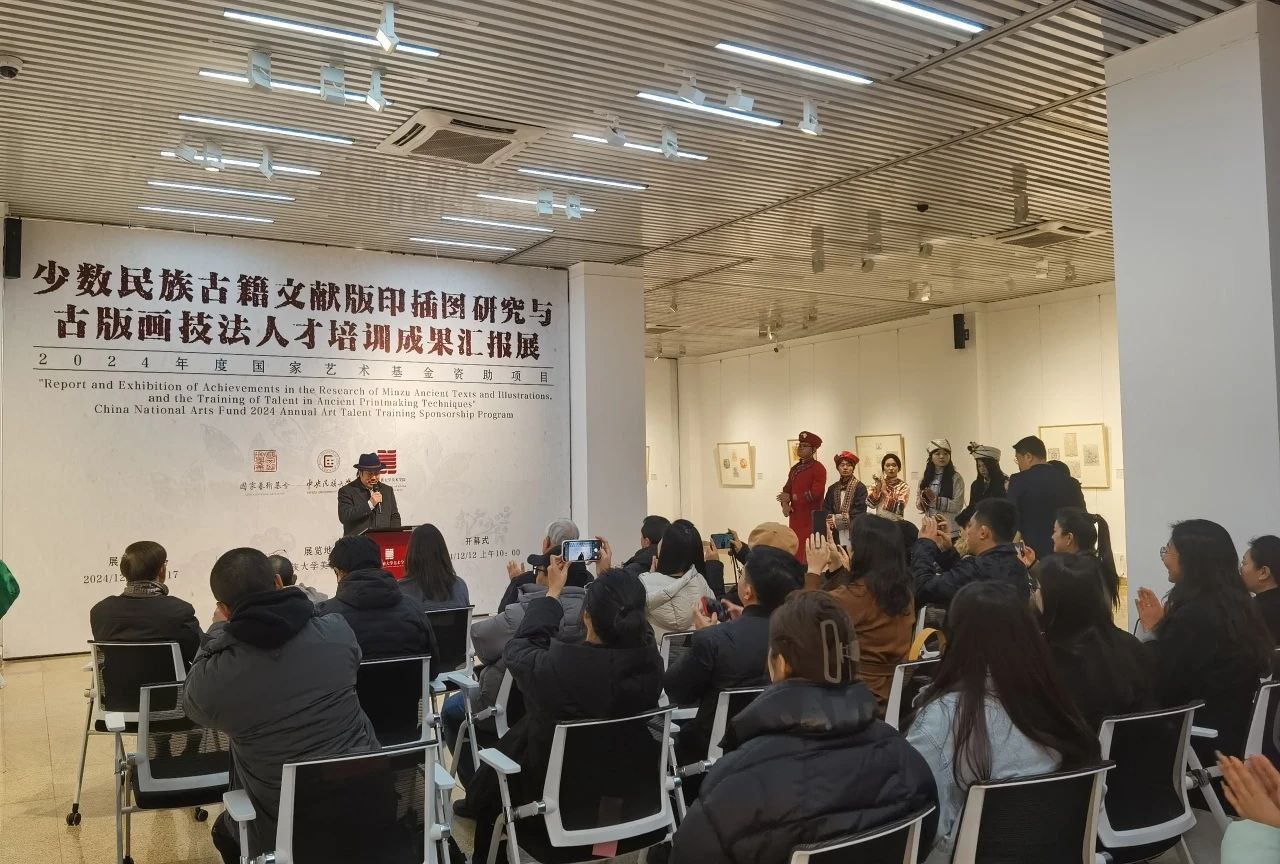 新闻网讯 12月12日上午,国家艺术基金人才培训项目《少数民族古籍文献版印插图研究与古版画技法人才培训》成果汇报展在ag视讯美术馆开幕。此次成果展览主题聚焦“承古籍版印精魂,启艺术传承新篇”。
