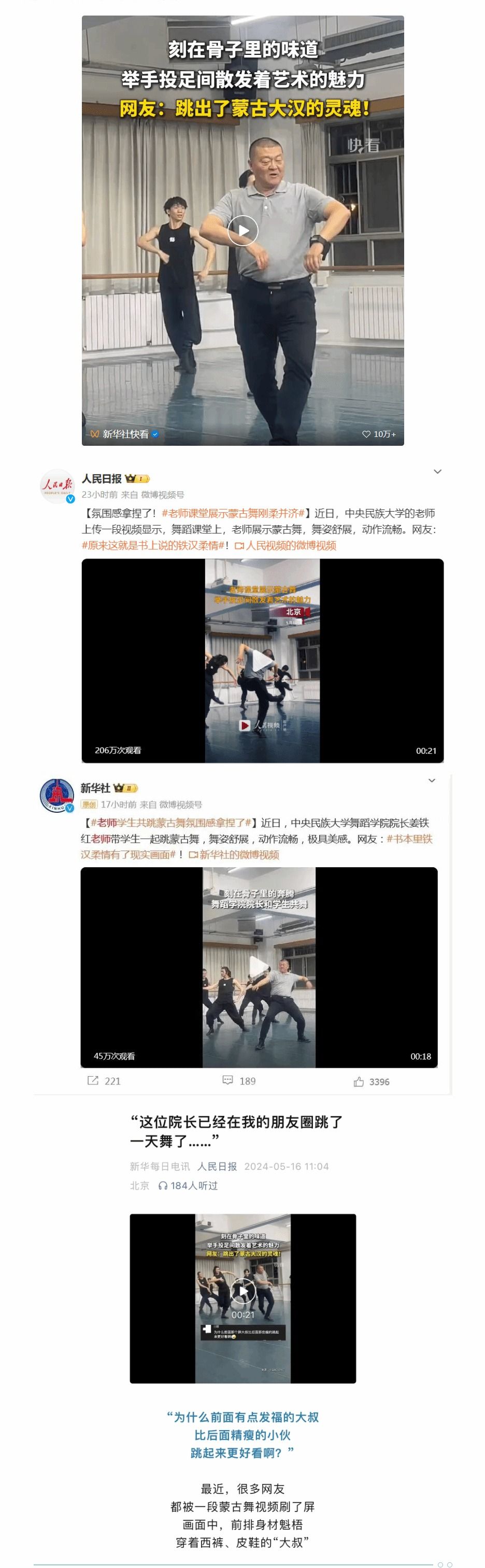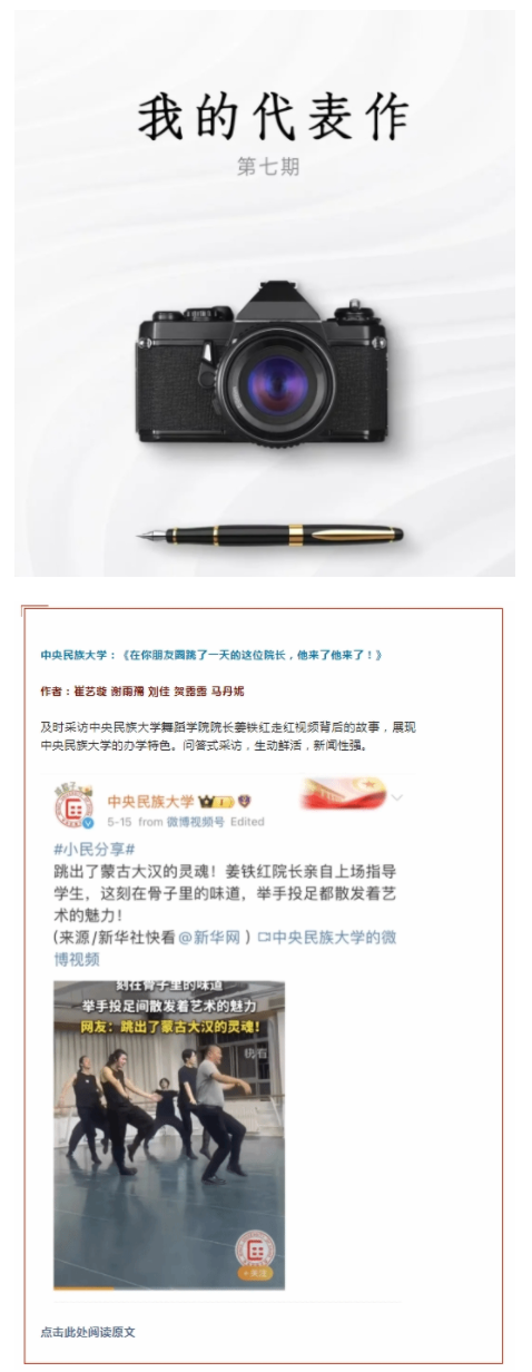 作品《在你的朋友圈跳了一天的这位院长,他来了他来了!》由ag视讯党委宣传部融媒体中心策划制作,文章以问答式采访,图文并茂地报道了学校舞蹈学院院长姜铁红身兼“舞者”“师者”双重身份和“走红”视频背后的故事,生动讲述了姜铁红和学生所跳舞蹈《奔腾》的创作背景以及舞蹈背后铸牢中华民族共同体意识与传承中华优秀传统文化的故事,报道生动鲜活、新闻性强。