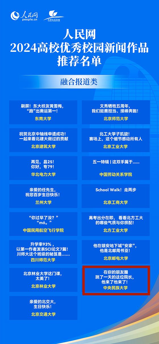 新闻网讯 12月27日,以“推进教育科技人才一体发展 加快建设教育强国”为主题的人民网2024大学校长论坛在北京人民日报社举行。论坛上,人民网2024年高校优秀校园新闻作品正式公布。ag视讯官方微信公众号发布的《在你的朋友圈跳了一天的这位院长,他来了他来了!》一文入选人民网2024年高校优秀校园新闻作品(融合报道类)。